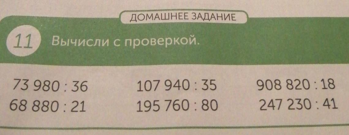 ДОМАШНЕЕ ЗАДАНИЕ 11 Вычисли с проверкой. 73 980:36 68 880:21 107 940:35 195 760:80 908 820:18 247 230:41 пж помогите