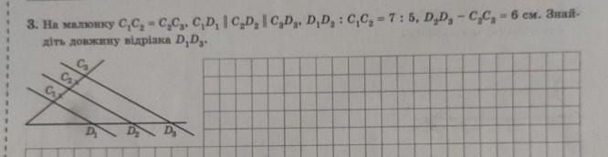 На малюнку C¹C² = C²C³, C¹D¹ || C²D² || C³D⁴ , D¹D² : C¹C² = 7 : 5 , D²D³ - C²C³ = 6 см. Знайдіть довжину відрізка D¹D³