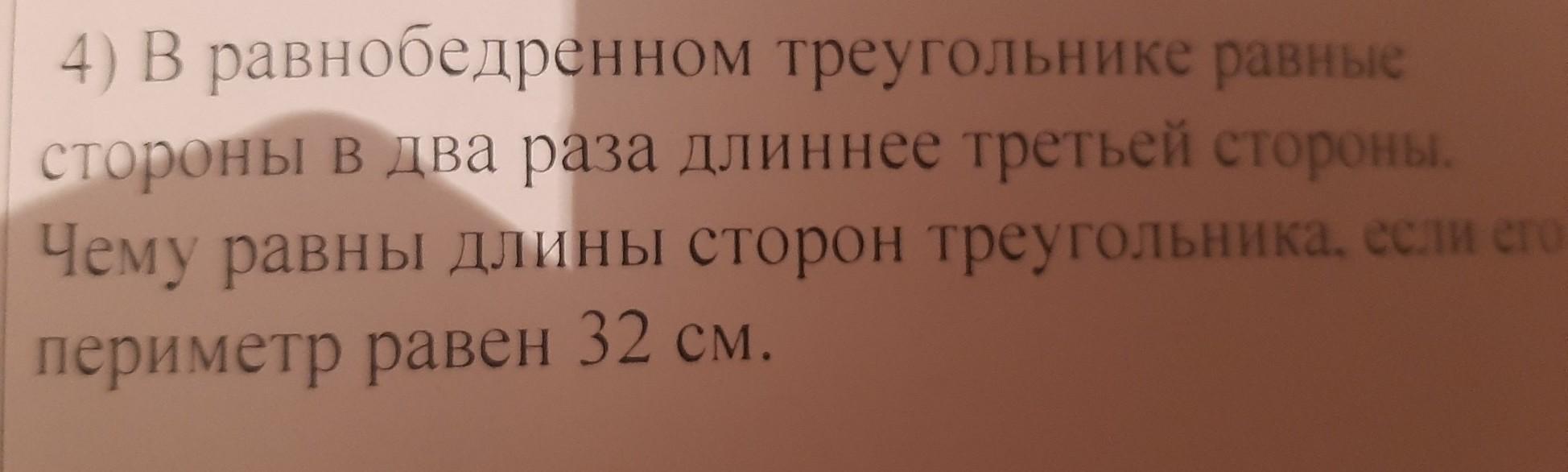 в равнобедренном треугольнике равные стороны в два раза длиннее третьей стороны. чему равны длины сторон треугольника, если его периметр равен 32 см.