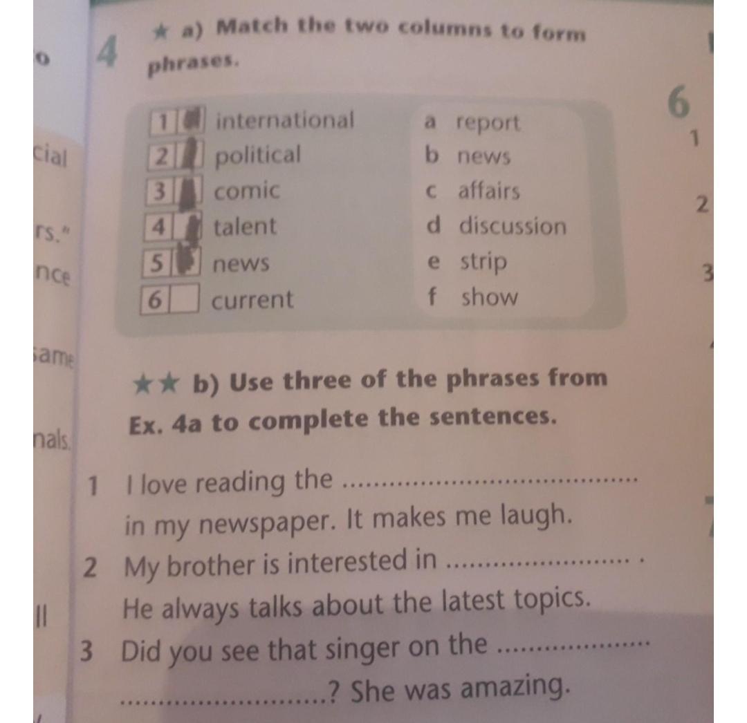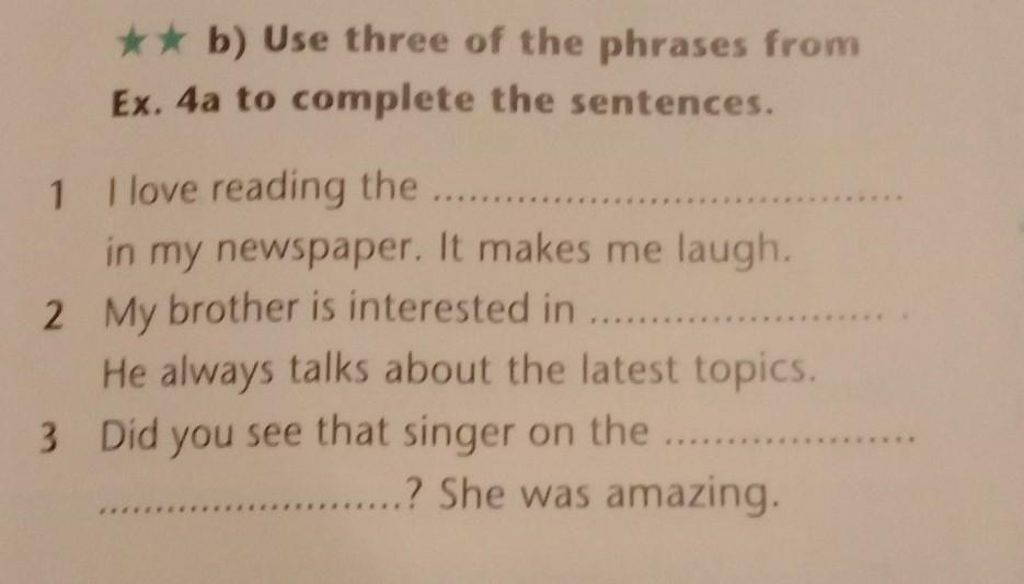 ★★ b) Use three of the phrases from Ex. 4a to complete the sentences. 1 I love reading the in my newspaper. It makes me laugh. 2 My brother is interested in He always talks about the latest topics. 3 Did you see that singer on the ? She was amazing.