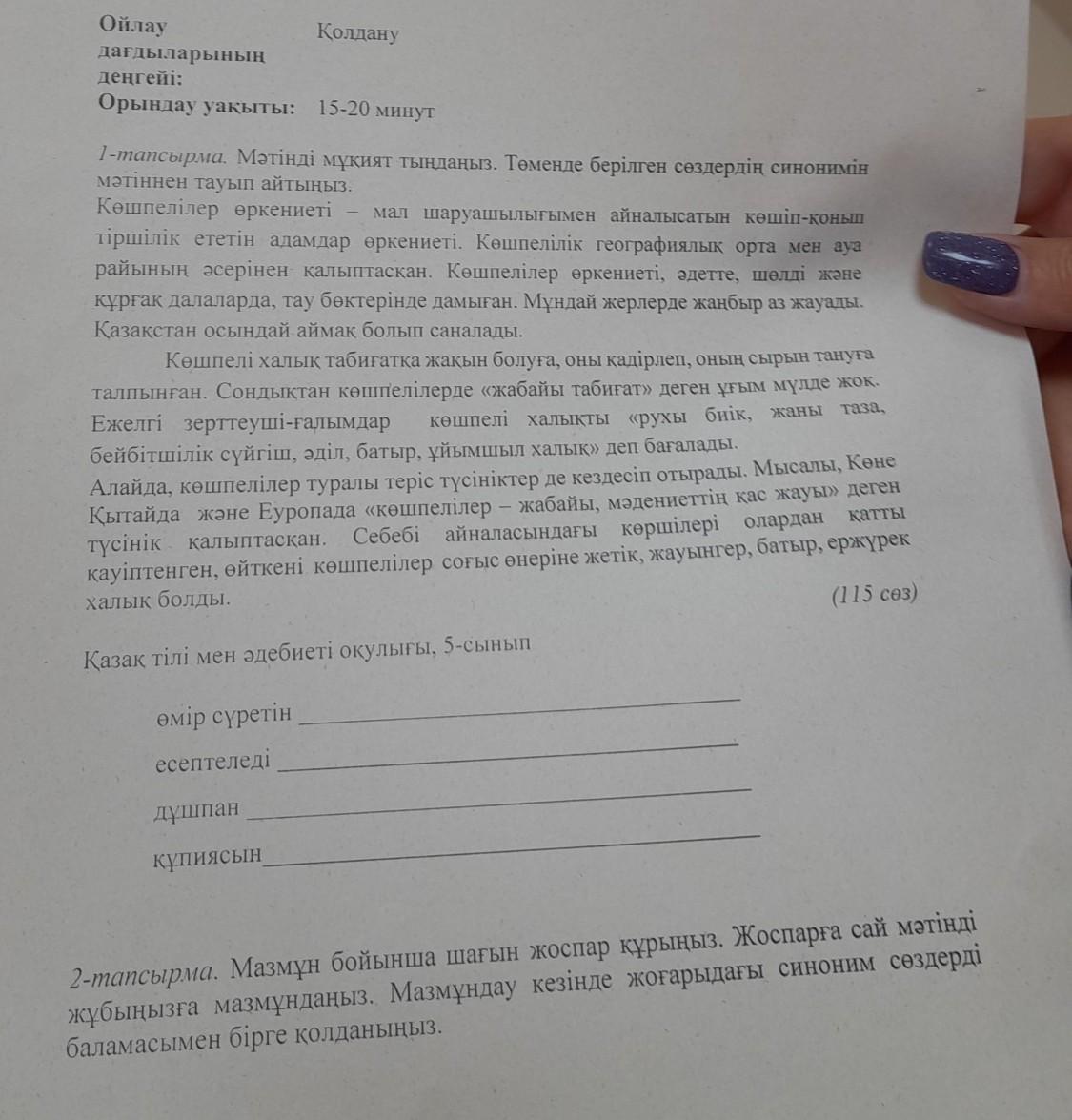 Ойлау дағдыларының деңгейi: Орындау уақыты: 15-20 минут Қолдану 1-тапсырма. Мәтінді мұқият тыңдаңыз. Төменде берілген сөздердің синонимін мәтіннен тауып айтыңыз. Көшпелілер өркениеті мал шаруашылығымен айналысатын көшіп-қонып тіршілік ететін адамдар өркениеті. Көшпелілік географиялык орта мен ауа райынын әсерiнен калыптаскан. Көшпелілер өркениеті, әдетте, шелді және құрғақ далаларда, тау бөктерінде дамыған. Мұндай жерлерде жанбыр аз жауады. Казакстан осындай аймак болып саналады. Көшпелі халық табиғатқа жақын болуға, оны кадірлеп, онын сырын тануға талпынған. Сондықтан көшпелілерде «жабайы табиғат» деген ұғым мулде жок. Ежелгі зерттеуші-ғалымдар көшпелі халыкты «рухы биік, жаны таза, бейбітшілік сүйгіш, әділ, батыр, ұйымшыл халык» деп бағалады. Алайда, көшпелілер туралы теріс түсініктер де кездесіп отырады. Мысалы, Кене Қытайда және Еуропада «көшпелілер - жабайы, мәдениеттiн кас жауы» деген түсінік қалыптасқан. Себебі көршілері олардан кауіптенген, өйткені көшпелілер соғыс өнерiне жетік, жауынгер, батыр, ержүрек халык болды. айналасындағы катты (115 сөз) Қазақ тілі мен әдебиеті окулыгы, 5-сынып өмір сүретін есептеледі дұшпан құпиясын 2-тапсырма. Мазмұн бойынша шағын жоспар құрыңыз. Жоспарға сай мәтінді жұбынызга мазмұндаңыз. Мазмұндау кезінде жоғарыдағы синоним сөздерді баламасымен бірге колданыныз.