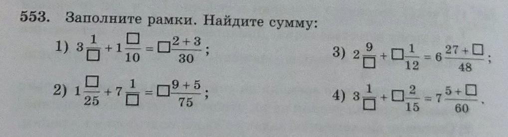 553. Заполните рамки. Найдите сумму: 1 1) 3 +10-02+3; ¯ 2) 1 25 +7 ⁹+5 75 ; 3) 25 4) 3 + 15 6 = 7 27 +0. 48 5+0 60 помогите пожалуйста а то мне ужас что будет ❤️