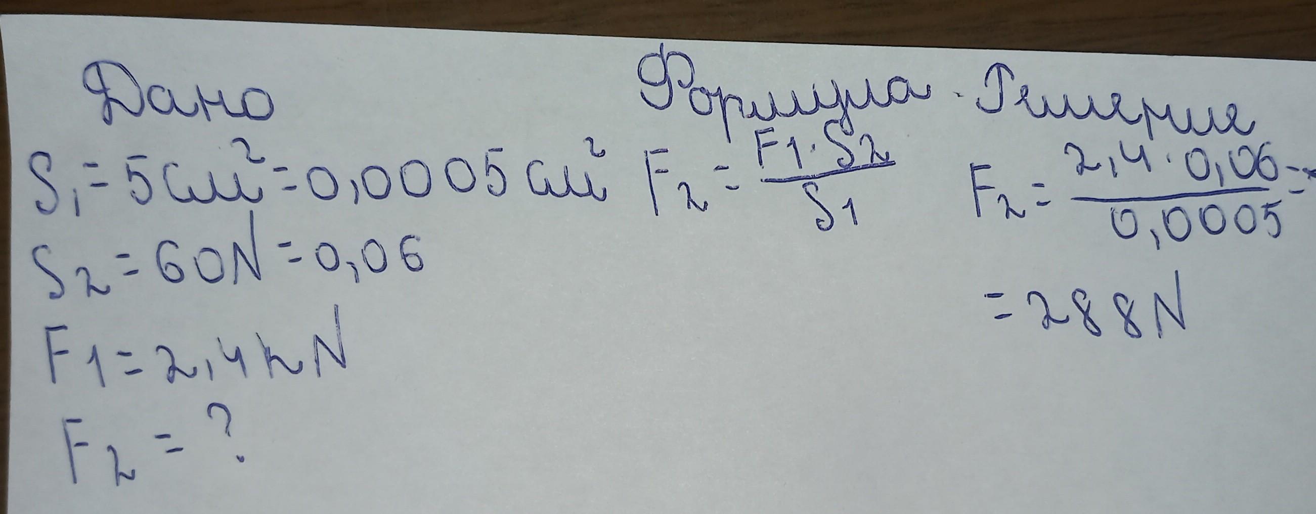 3)Площадь поверхности малого поршня гидравлического пресса равна 5 см² и на него действует сила 60 N.Чему равна площадь большого поршня,если на него действует подъемная сила равная 2,4kN?