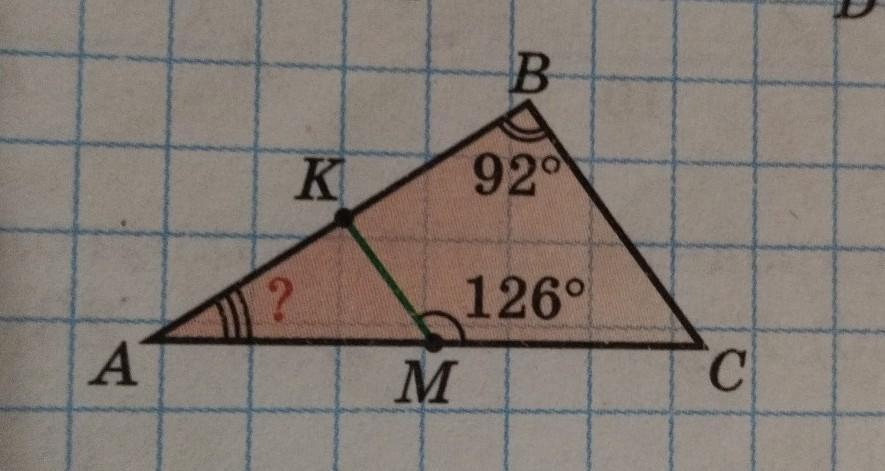 ∠KMC =∠A+∠AKM (∠KMC - внешний угол △AKM) => ∠A=126°-92°=34°
