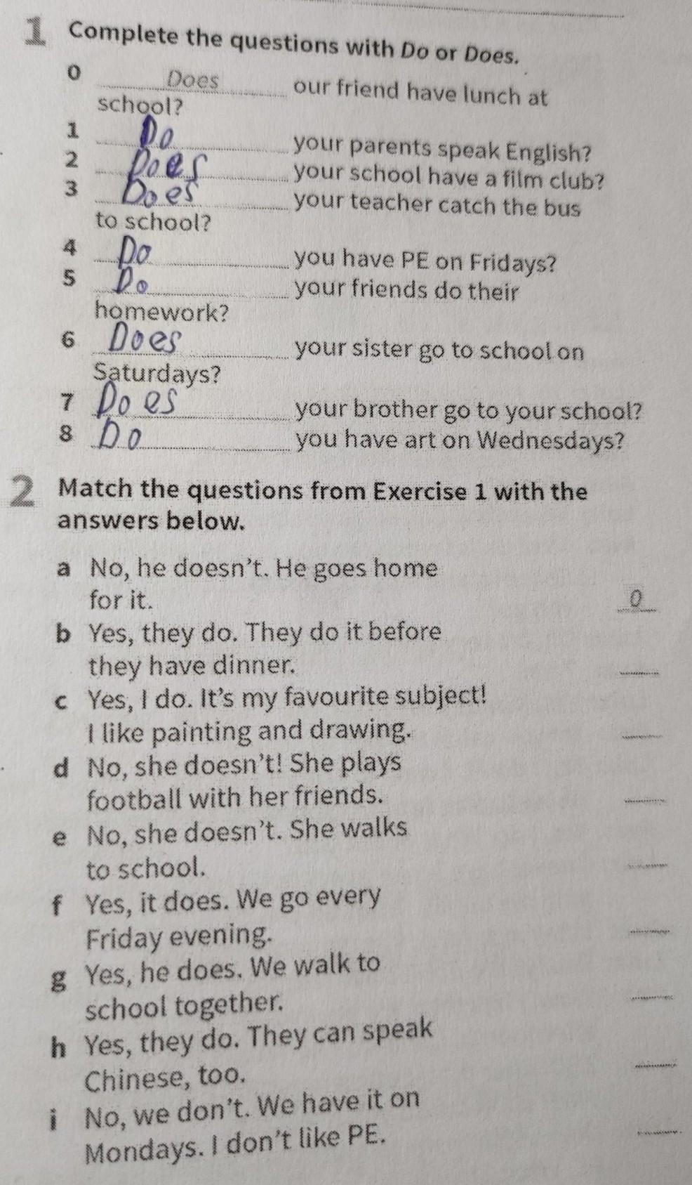 Present simple 1 Complete the questions with Do or Does. Does our friend have lunch at 0 123 4 5 f school? Pe Boes to school? Do Do g homework? Does Saturdays? 6 7 Do es 8 Do.. your parents speak English? your school have a film club? your teacher catch the bus you have PE on Fridays? your friends do their 2 Match the questions from Exercise 1 with the answers below. your sister go to school on your brother go to your school? you have art on Wednesdays? a No, he doesn't. He goes home for it. b Yes, they do. They do it before they have dinner. c Yes, I do. It's my favourite subject! d I like painting and drawing. No, she doesn't! She plays football with her friends. e No, she doesn't. She walks to school. Yes, it does. We go every Friday evening. Yes, he does. We walk to school together. h Yes, they do. They can speak Chinese, too. i No, we don't. We have it on Mondays. I don't like PE