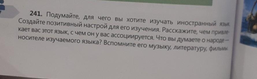 241. Подумайте, для чего вы хотите изучать иностранный язык Создайте позитивный настрой для его изучения. Расскажите, чем привле кает вас этот язык, с чем он у вас ассоциируется. Что вы думаете о народе- носителе изучаемого языка? Вспомните его музыку, литературу, фильмы .