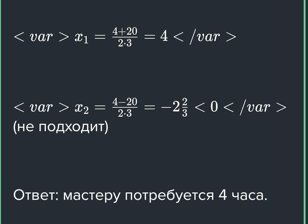 ДАЮ 50 БАЛЛОВМастеру требуется на 4 часа меньше времени, чем ученику, чтобы выполнить всю работу. Оба они выполняют всю работу за 2 часа 40 минут. За сколько часов мастер выполняет работу отдельно?