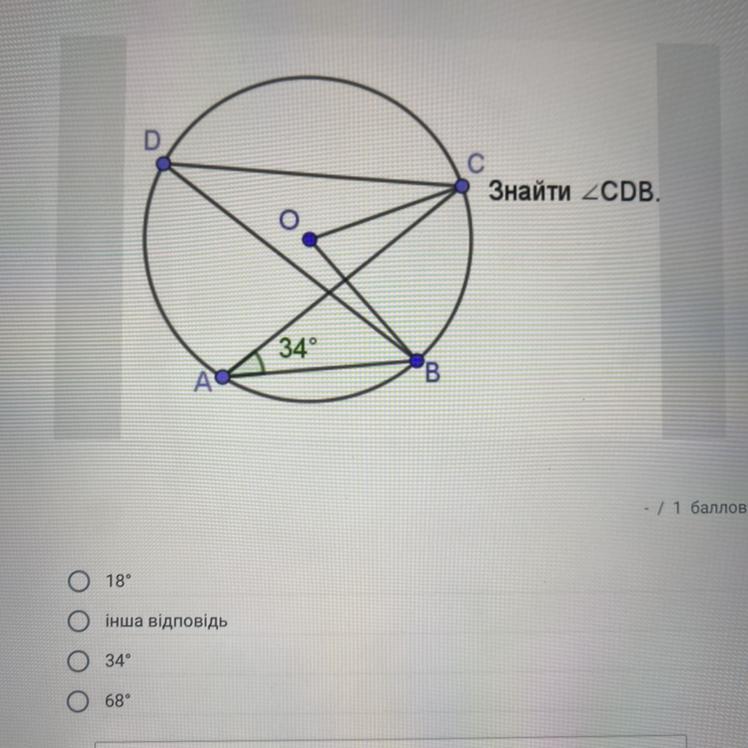 тк углы CDB и CAB являются вписаными в окружность и опираются на одну дугу то их градус будет равным =34°