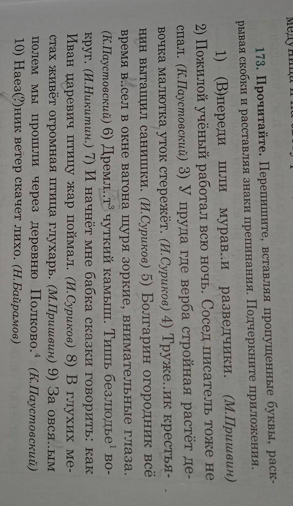1) Впереди шли муравьи разведчики. (М.Пришвин) 2) Пожилой учёный работал всю ночь. Сосед писатель тоже не спал. (К.Паустовский) 3) у пруда где верба стройная растёт девочка малютка уток стережет. (И.Суриков) 4) Труженик крестья- нин вытащил санишки. (И.Суриков) 5) Болгарин огородник всё время весел в окне вагона щуря зоркие, внимательные глаза. (К.Паустовский) 6) Дремлят³ чуткий камыш. Тишь безлюдье¹ во- круг. (И.Никитин.) 7) И начнёт мне бабка сказки говорить: как Иван царевич птицу жар поймал. (И.Суриков) 8) в глухих местах живёт огромная птица глухарь. (М.Пришвин) 9) За овсяным полем мы прошли через деревню Полково.4 (К.Паустовский) 10) Наездник ветер скачет лихо. (Н.Байрамов)