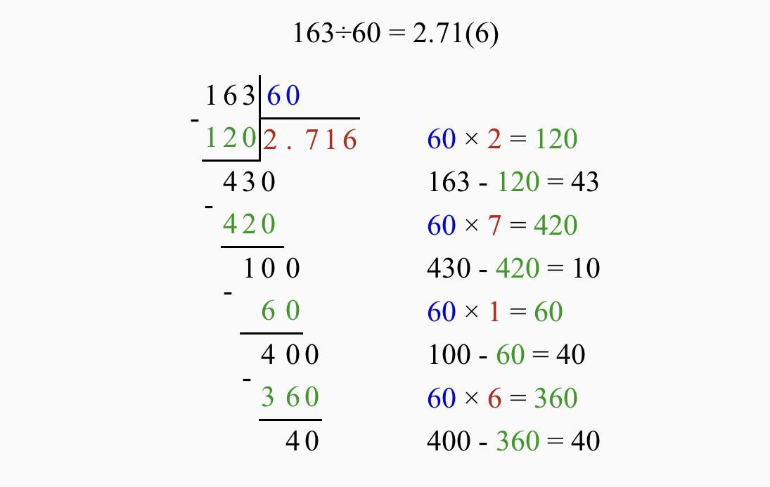 163/60 = 163 : 60 = 2,71666... = 2,71(6)