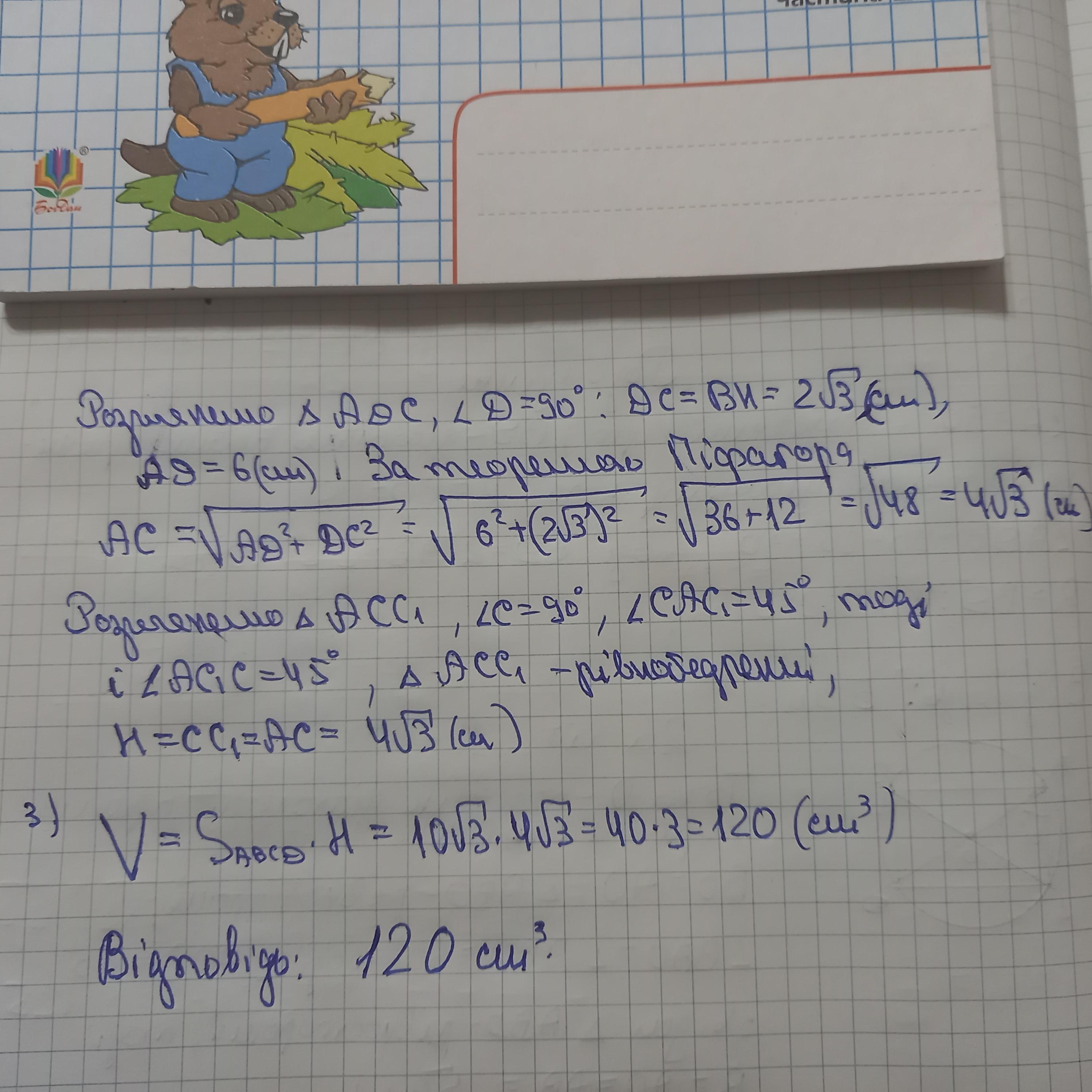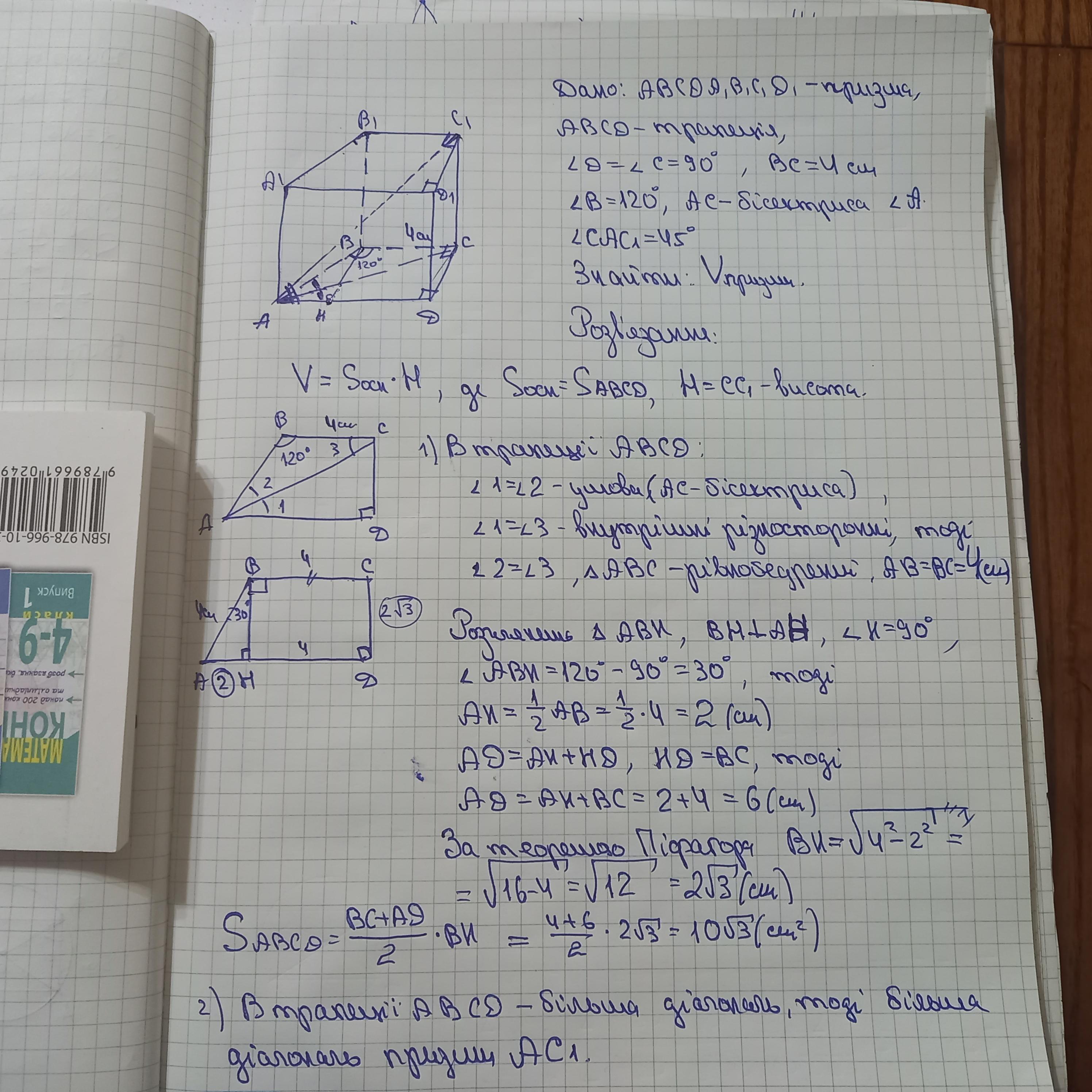 В основі прямої призми лежить прямокутна трапеція з тупим кутом 120° і меншою основою 4. Діагональ трапеції є бісектрисою її гострого кута. Більша діагональ призми утворює з площиною основи кут 45°. Знайдіть об'єм цієї призми.