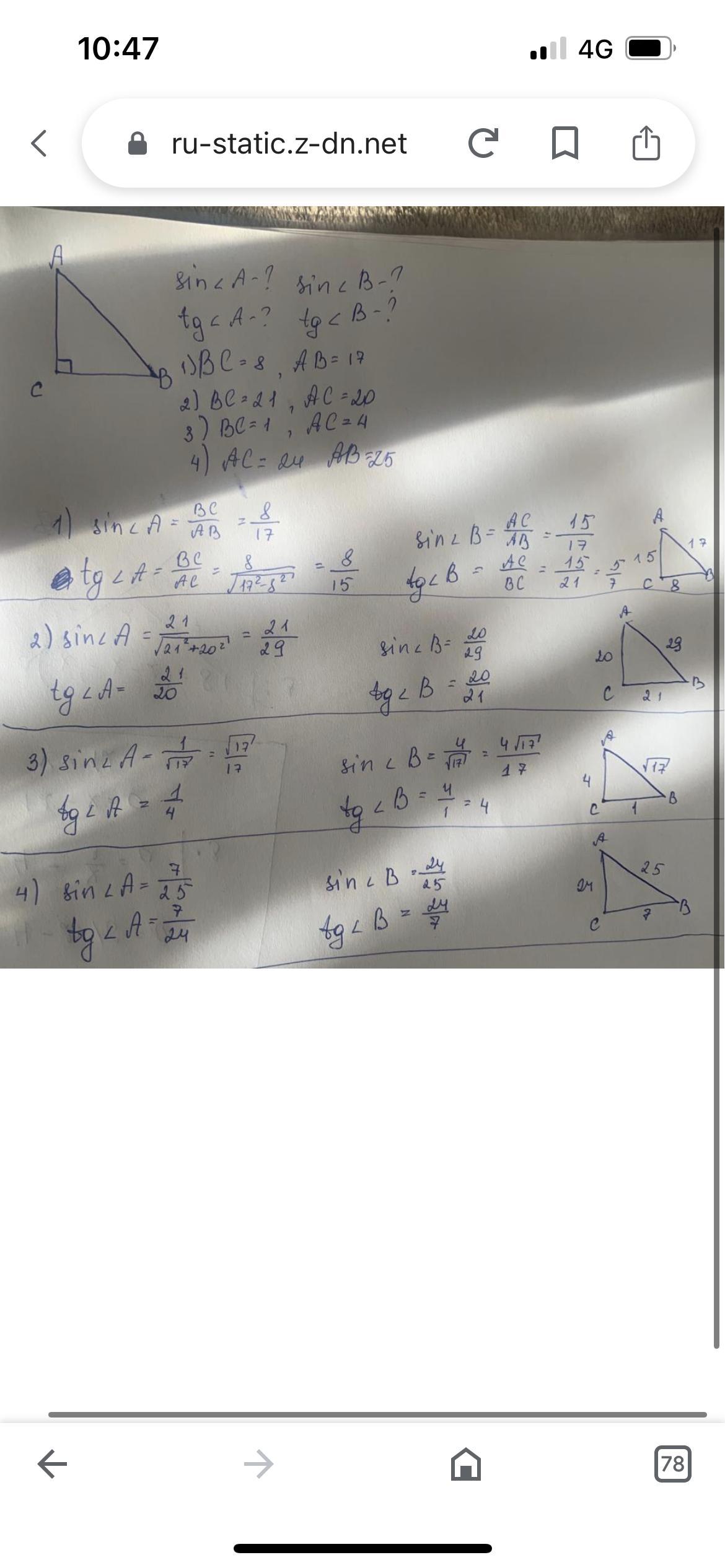 в треугольнике ABC угол C = 90°. Найдите синус косинус и тангенс углов A и B, если: 1) BC=8, AB=17; 2) BC=21, AC=20; 3) BC=1, AC=2; 4) AC=24, AB=25. (с решением и дано!!!!!!!!)