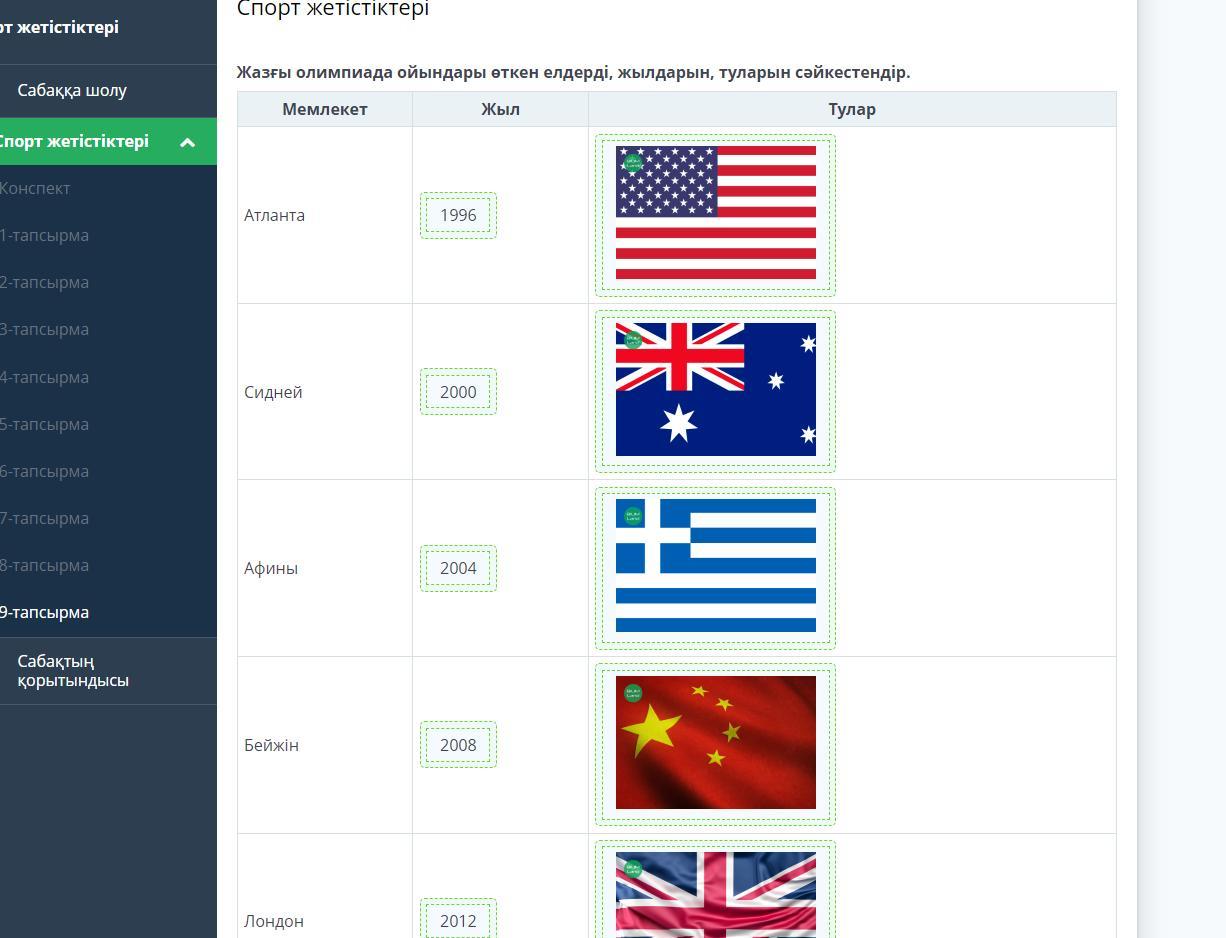 Жазғы олимпиада ойындары өткен елдерді, жылдарын, туларын сәйкестендір. Мемле кет Атланта Сидней Афины Бейжін Лондон Рио-де- Жанейр 0 Жыл 2012 С ✪ Жылдар: + 1996 Тулар +2016 +2008 +2000 +2004 米