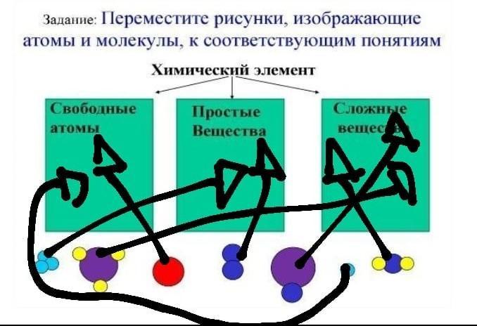 стрелками соединила, надеюсь понятно. свободные атомы это когда только один атом одного цвета, простые когда может быть несколько атомов но они одного цвета а сложные когда несколько атомов разных цветов