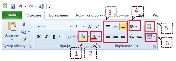 На малюнку зображено групи для форматування Шрифт електронних таблиць та Вирівнювання вкладки Основне. Якою цифрою позначено Перенесення тексту?