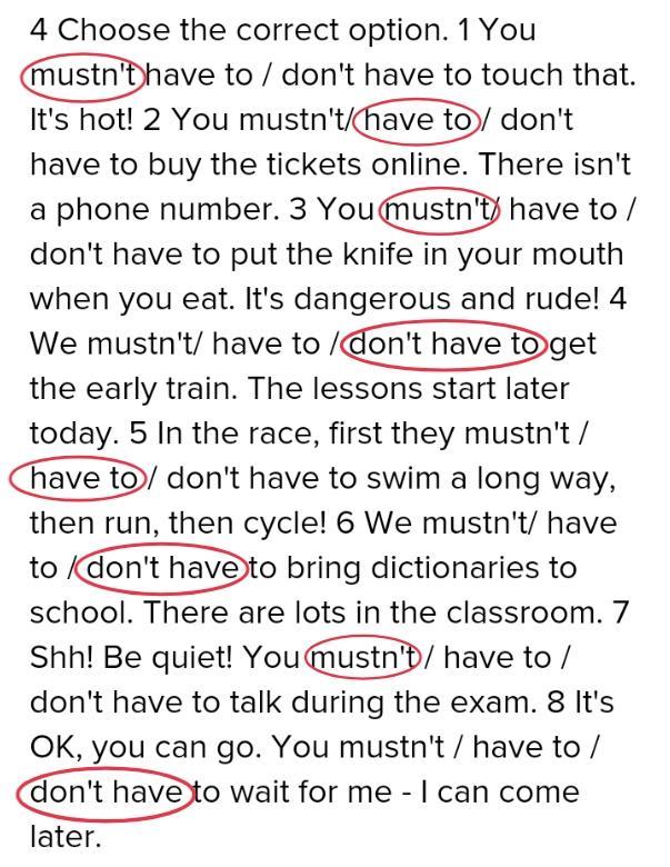 4 Choose the correct option. 1 You mustn't have to / don't have to touch that. It's hot! 2 You mustn't/ have to / don't have to buy the tickets online. There isn't a phone number. 3 You mustn't/ have to / don't have to put the knife in your mouth when you eat. It's dangerous and rude! 4 We mustn't/ have to / don't have to get the early train. The lessons start later today. 5 In the race, first they mustn't / have to / don't have to swim a long way, then run, then cycle! 6 We mustn't/ have to / don't have to bring dictionaries to school. There are lots in the classroom. 7 Shh! Be quiet! You mustn't / have to / don't have to talk during the exam. 8 It's OK, you can go. You mustn't / have to / don't have to wait for me - I can come later.
