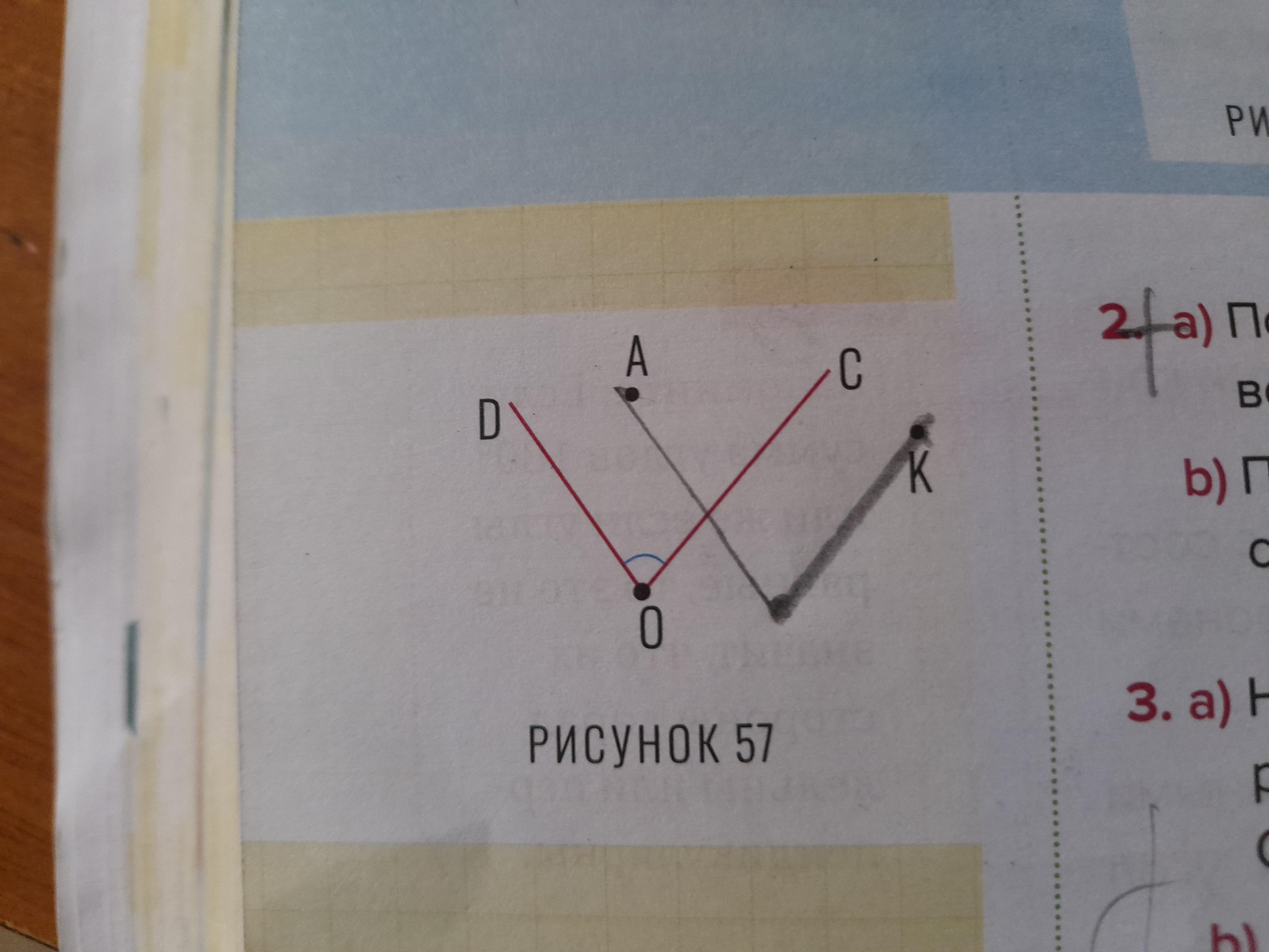 2. а) Постройте угол с вершиной в точке А и со сторонами соот- ветственно параллельными сторонам угла DOC (рисунок 57). b) Постройте угол с вершиной в точке К и со сторонами соответ- ственно перпендикулярными сторонам угла DOC (рисунок 57).
