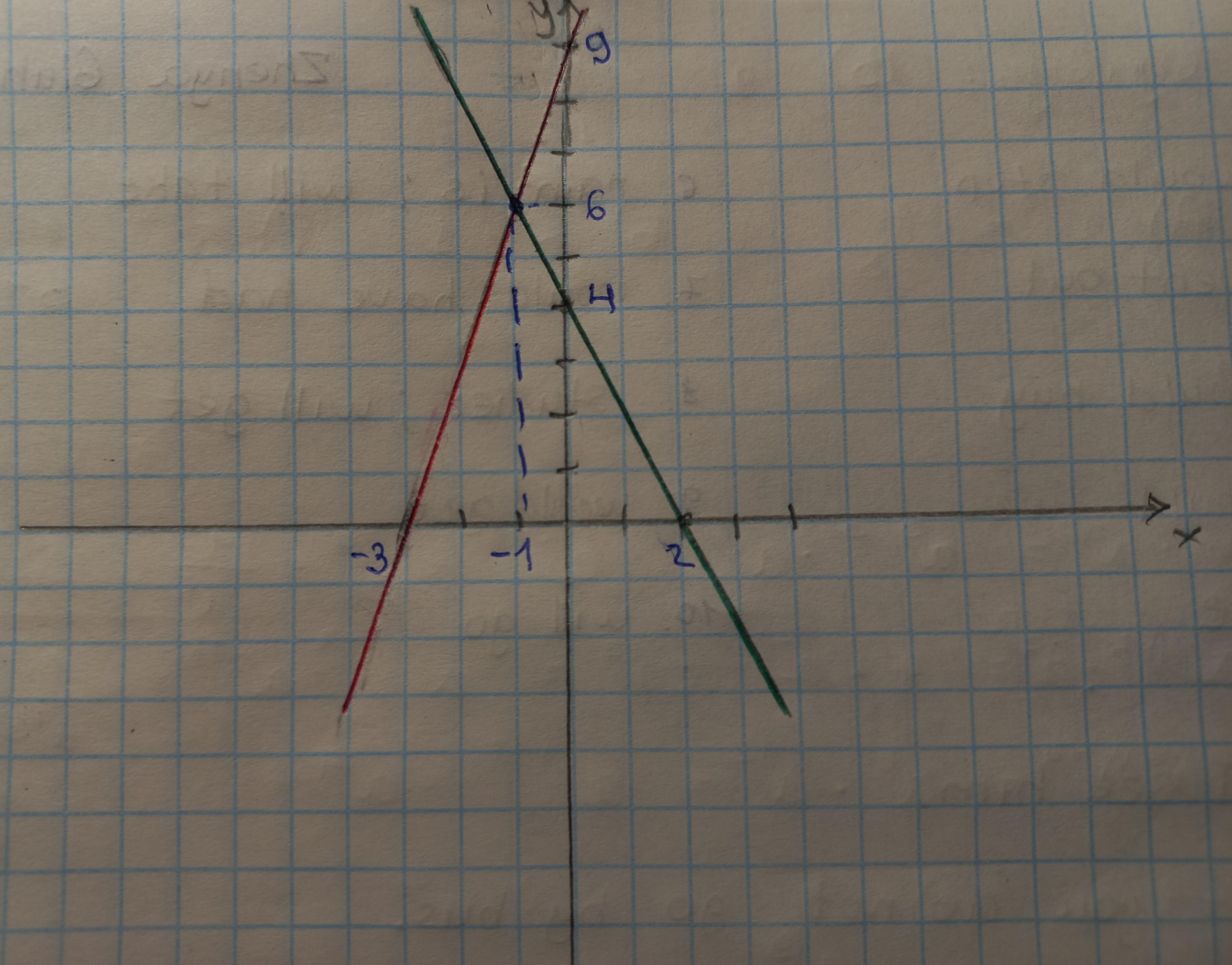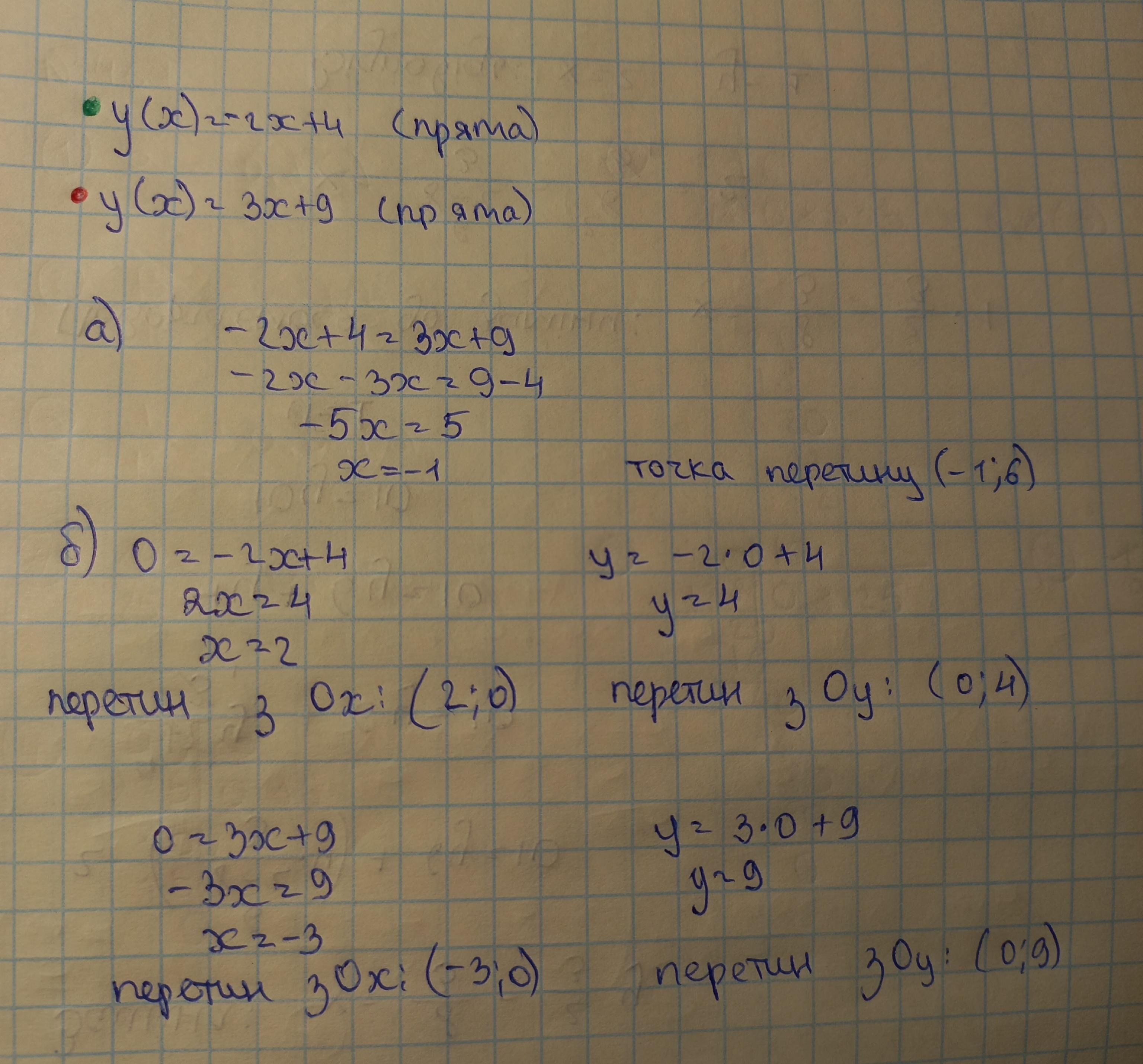 Постройте в одной координатной плоскости графики функций y(x) = -2x + 4 и y(x) = 3x +9. Найдите: а) координаты точки пересечения этих графиков б) координаты точек пересечения графиками осей координат.