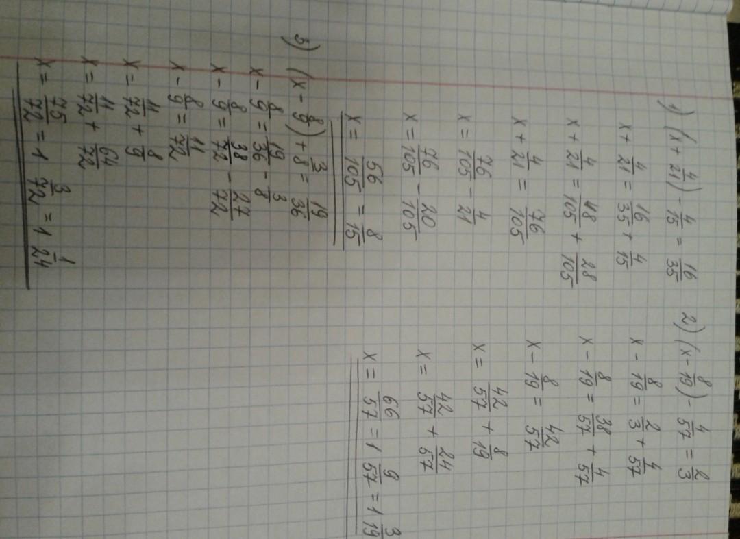 слагаемые переносятся из одной части уравнения в другую изменяя свой знак на противоположный.смотри в 1) -4/15 перенесем и запишем 16/35 + 4/15.