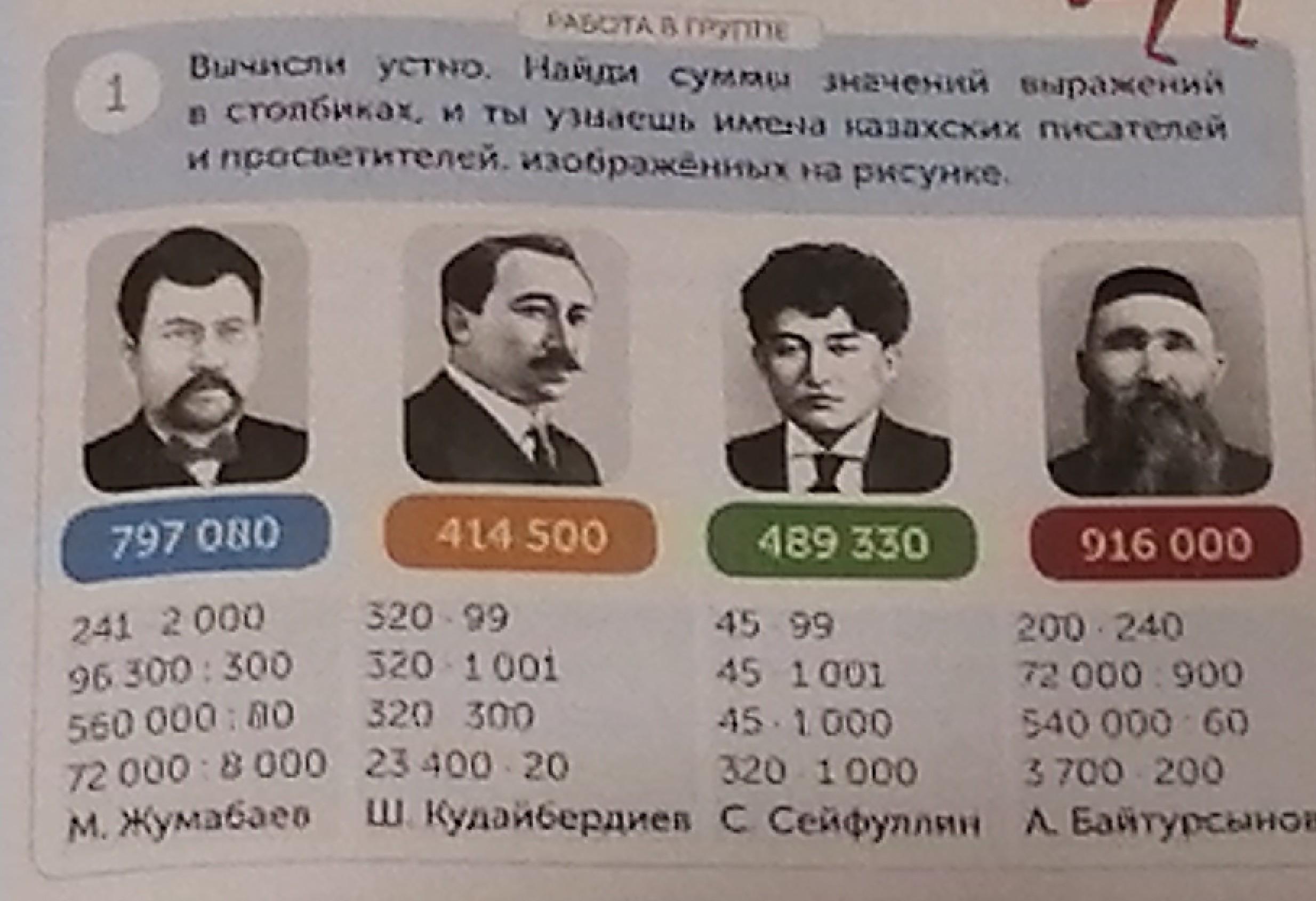 РАБОТА В ГРУППЕ 1 Вычисли устно. Найди суммы значений выражений в столбиках, и ты узнаешь имена казахских писателей и просветителей, изображённых на рисунке. 797 080 ных чисел. 241 2 000 96 300 300 560 000: 80 414 500 320-99 320 1001 489 330 45.99 45-1001 916 000 200-240 72 000:900 320-300 540 000:60 72 000:8 000 23 400 20 3700-200 М.Жумабаев Ш. Кудайбердиев С. Сейфуллин А. Байтурсынс 45 1000 320-1000