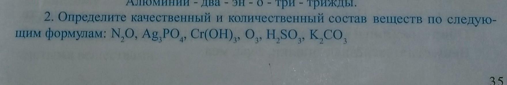 Определите качественный и количественный состав веществ по следую- щим формулам: N2O, Ag3PO4, Cr(OH)3, O3, H2SO3, K2CO3