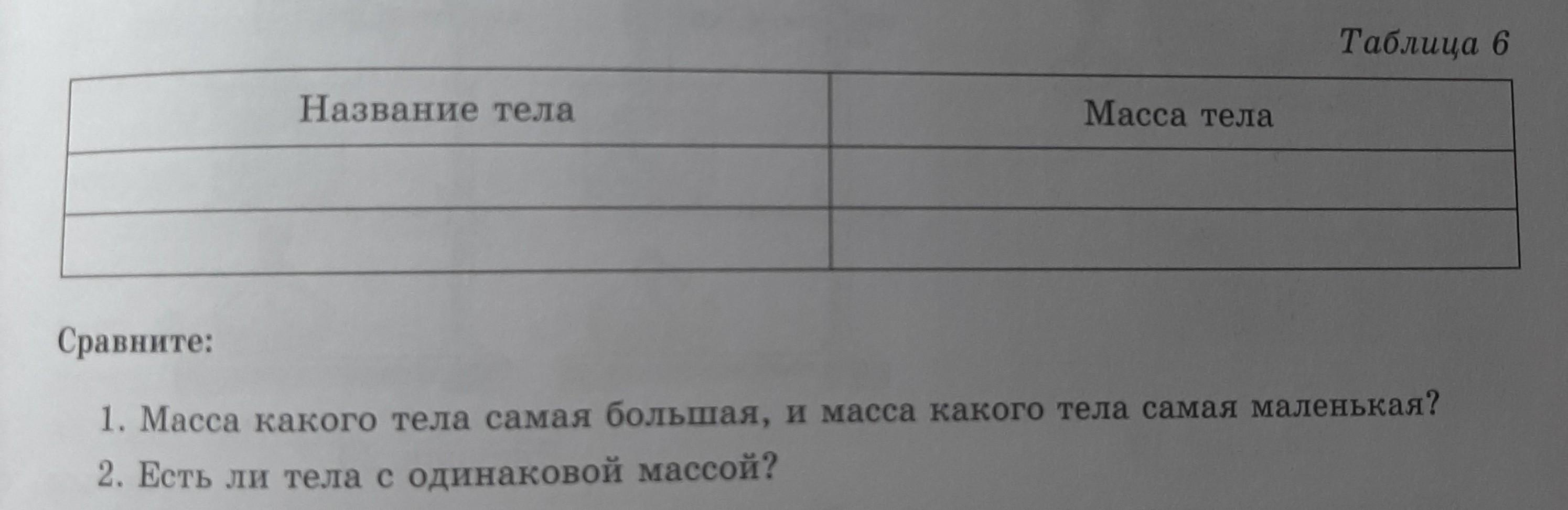 Название тела Масса тела Таблица 6 Сравните: 1. Масса какого тела самая большая, и масса какого тела самая маленькая, 2. Есть ли тела с одинаковой массой? помогите срочноооо