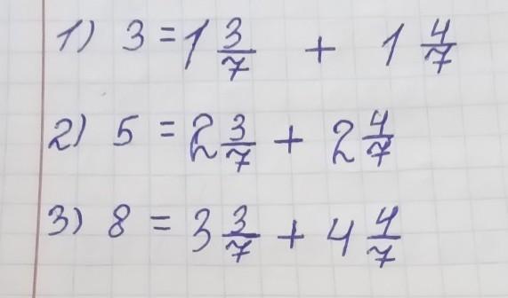 541. Запишите натуральные числа: 1) 3; 2) 5; 3) 8; 4) 9 в виде суммы двух смешанных чисел, знаменатели которых равны 7 и 7.