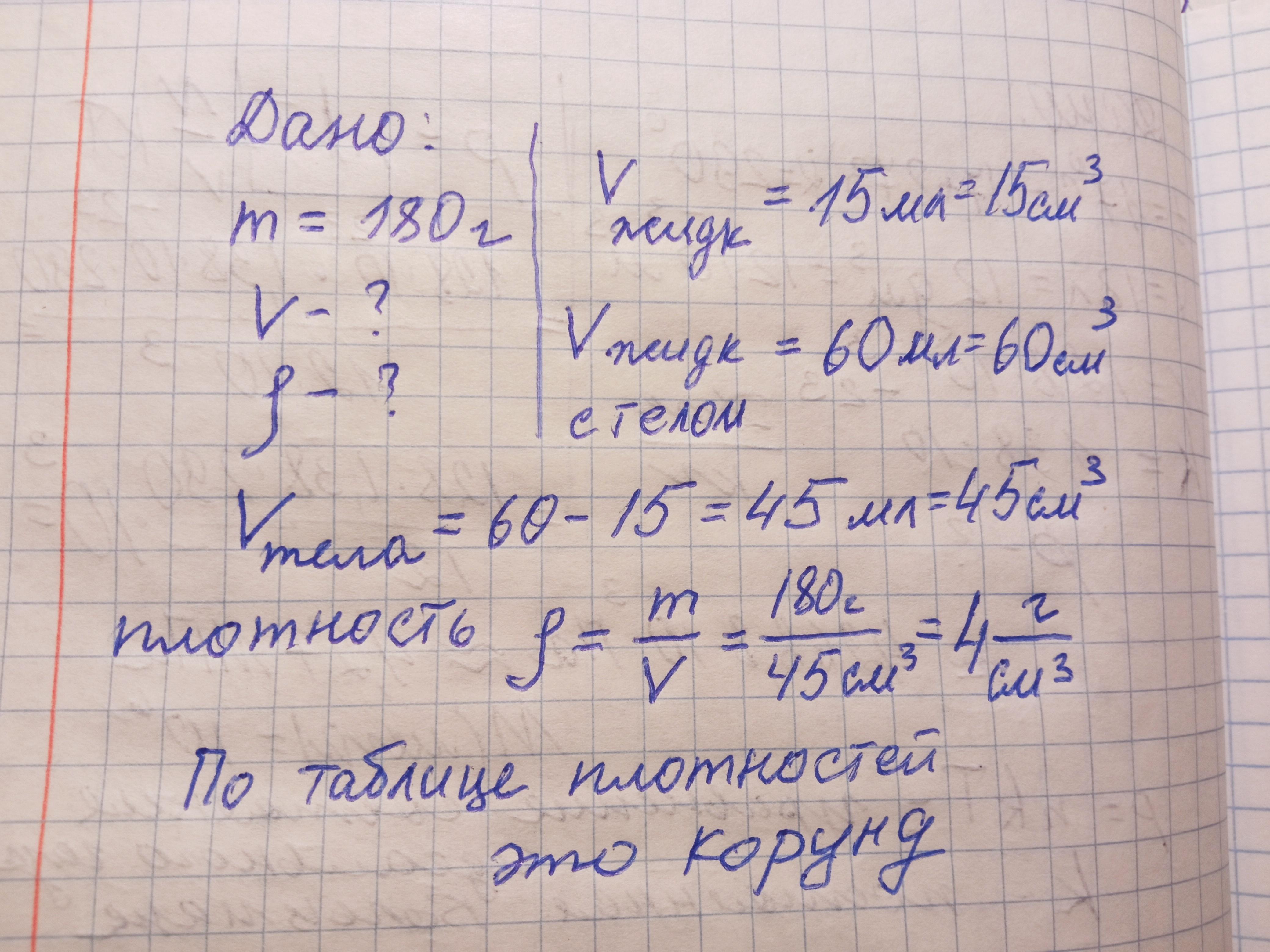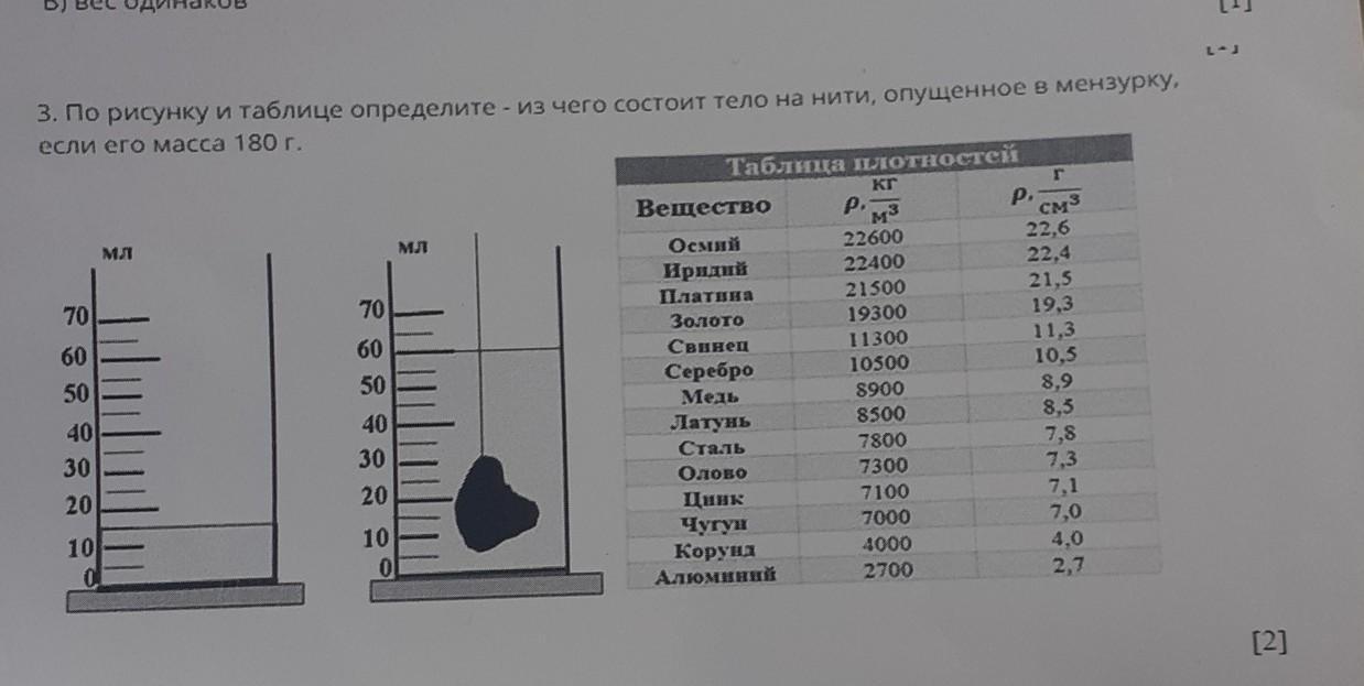 По рисунку и таблице определите-из чего состоит тело на нити, опущенное в мензурку, если его масса 180 г.