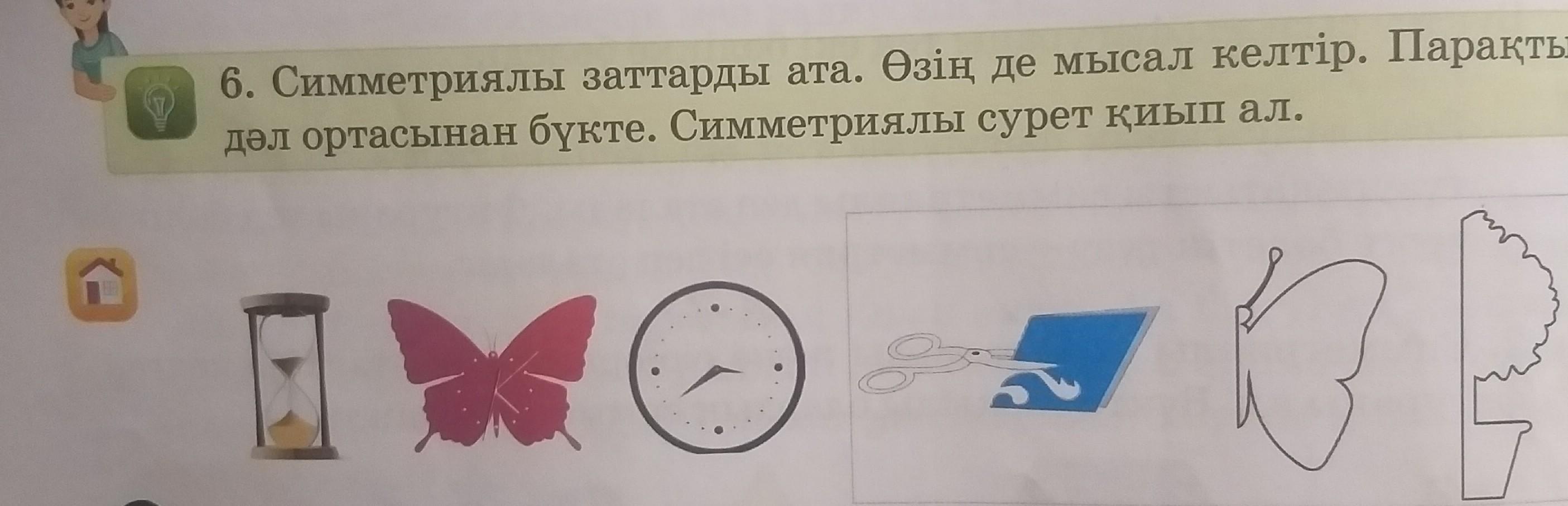 6. Симметриялы заттарды ата. Өзін де мысал келтір. Паракты Дәл ортасынан бүкте. Симметриялы сурет қиып ал.