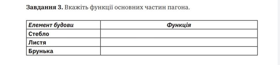 Завдання 3. Вкажіть функції основних частин пагона. Елемент будови Функція Стебло Листя Брунька