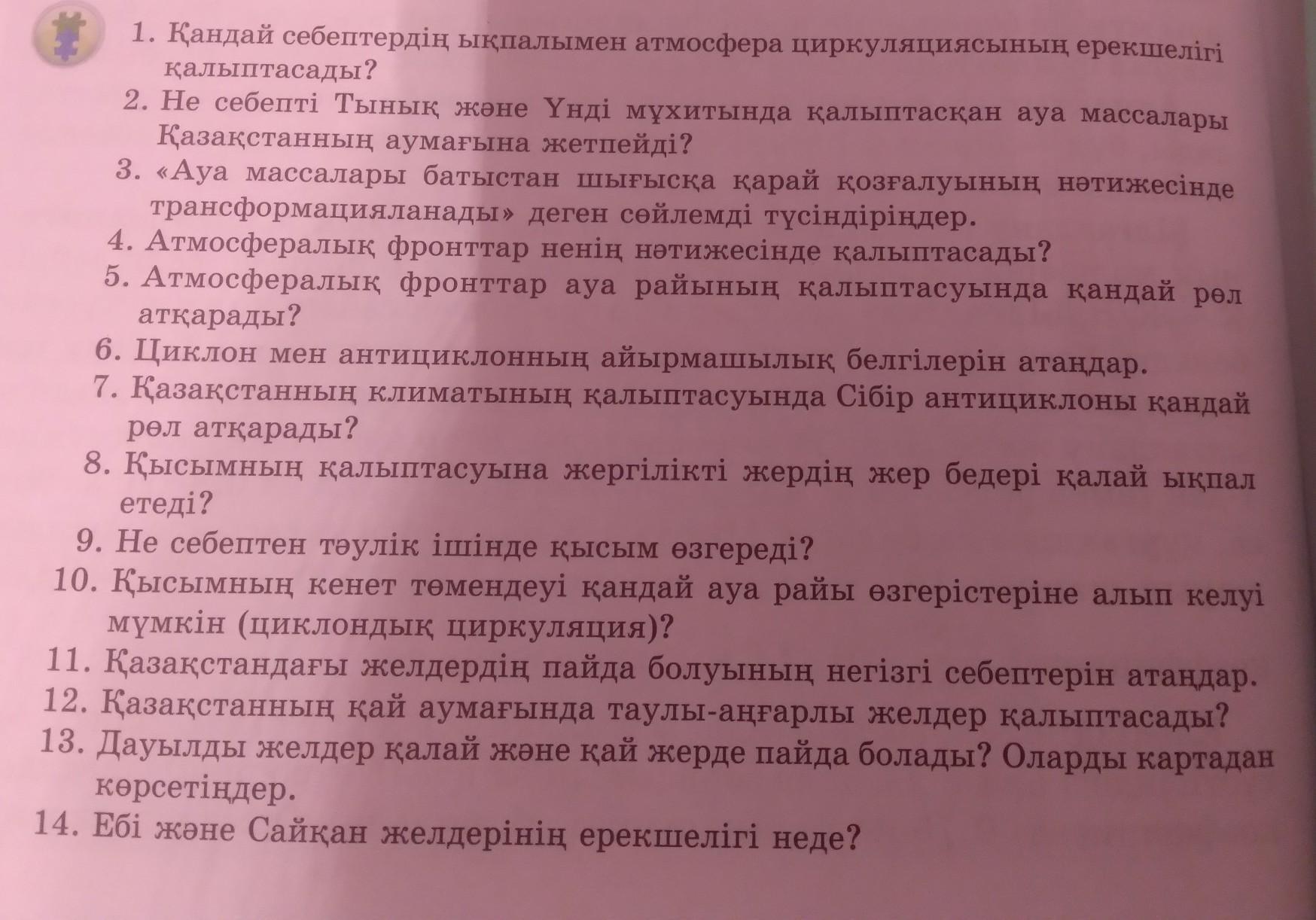 1. Кандай себептердiн ыкпалымен атмосфера циркуляциясының ерекшелiгi калыптасады? 2. Не себепті Тынык және Үндi мухитында қалыптасқан ауа массалары Қазақстаннын аумагына жетпейді? 3. «Ауа массалары батыстан шығысқа қарай козгалуының нәтижесінде трансформацияланады» деген сейлемдi түсiндiрiндер. 4. Атмосфералық фронттар ненің нәтижесінде калыптасады? 5. Атмосфералық фронттар ауа райынын калыптасуында кандай рөл атқарады? - Циклон мен антициклоннын айырмашылык белгілерін атаңдар. Қазақстанның климатынын калыптасуында Сібір антициклоны кандай рөл атқарады? Қысымның қалыптасуына жергiлiктi жердiн жер бедерi калай ыкпал етедi? Не себептен таулiк iшiнде кысым өзгереді? Қысымның кенет темендеуi кандай ауа райы өзгерістеріне алып келуi мумкін (циклондык циркуляция)? Сазакстандағы желдердiн пайда болуының негізгі себептерін атаңдар. азакстаннын кай аумағында таулы-ангарлы желдер калыптасады? ауылды желдер калай және кай жерде пайда болады? Оларды картадан -рсетіндер. і және Сайкан желдерінің ерекшелігі неде?