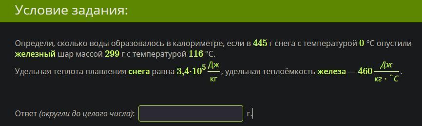 Определи, сколько воды образовалось в калориметре, если в 445 г снега с температурой 0 °С опустили железный шар массой 299 г с температурой 116 °C.