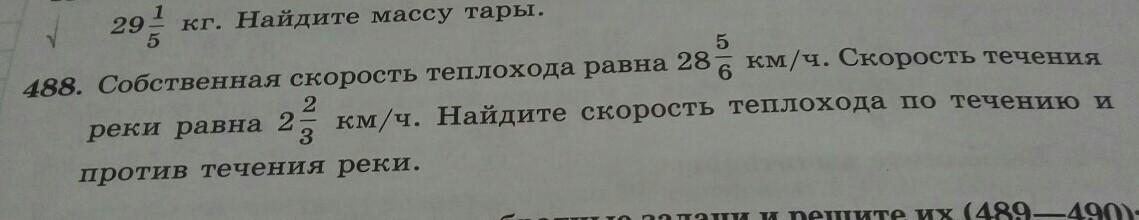 Сообственная скорость теплохода равна 28 5/6 км/ч.Скорость течения реки раввна 2/3км/ч.Найдите скорость теплохода по