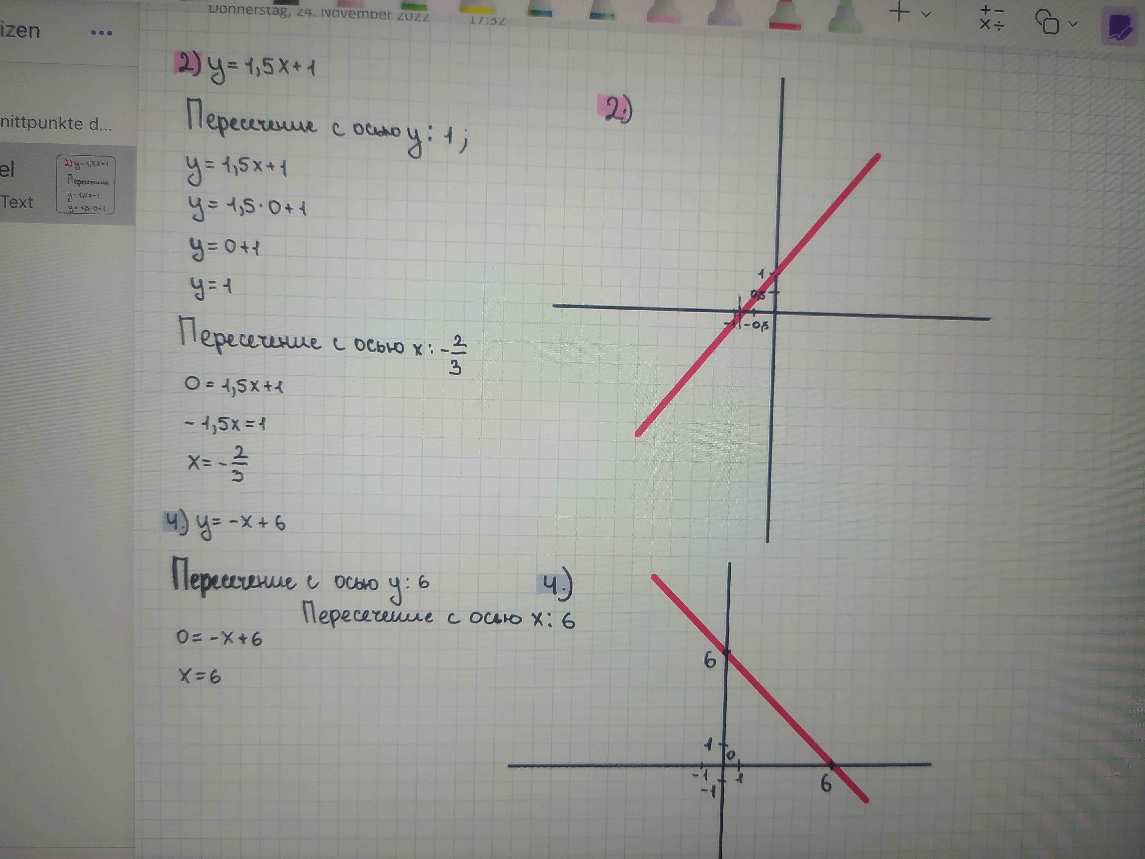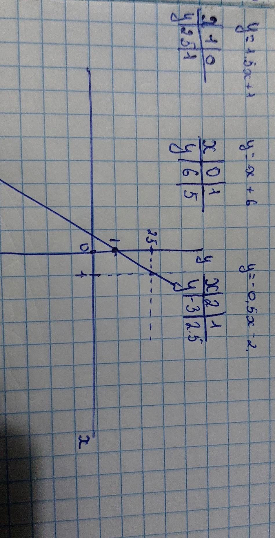 3,56. Найдите точки пересечения графика линейной функции с осями координат и постройте ее график: 2)у=1,5х + 1 ; 4) y = -x + 6; 6) y = -0,5x - 2.