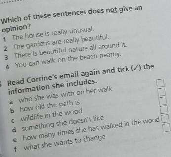 Which of these sentences does not give an opinion? 1 The house is really unusual. 2 The gardens are really beautiful. 3 There is beautiful nature all around it. 4 You can walk on the beach nearby. 3 Read Corrine's email again and tick (✓) the information she includes. a who she was with on her walk b how old the path is c wildlife in the wood d something she doesn't like e how many times she has walked in the wood f what she wants to change