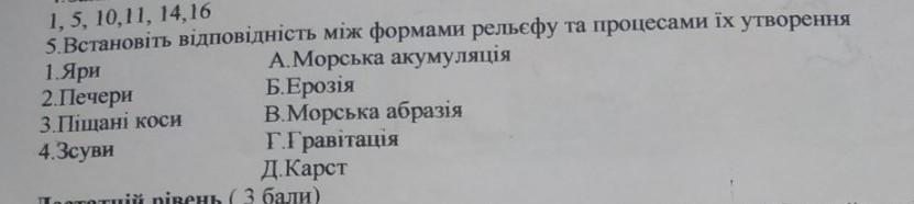 Встановіть відповідність між формами рельєфу та процесами їх утворення..