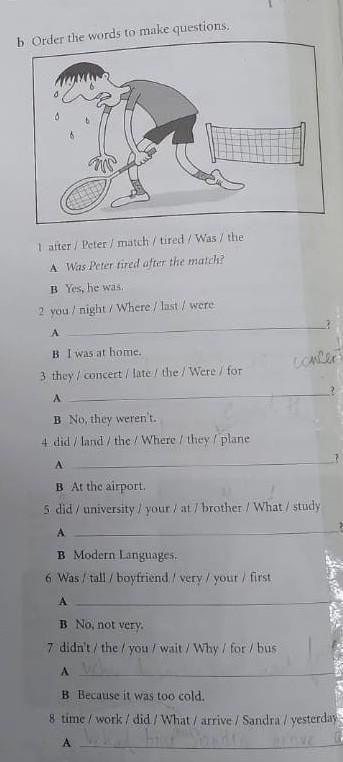 Order the words to make questions. 1 after / Peter / match/ tired / Was / the A Was Peter tired after the match? B Yes, he was. 2 you/ night/Where / last / were A B I was at home. 3 they / concert / late/ the / Were / for A B No, they weren't. 4 did / land/ the / Where/they/ plane A B At the airport. 5 did/university / your / at / brother/What / study A B Modern Languages. 6 Was/tall / boyfriend / very / your / first A B No, not very. 7 didn't/the/you/ wait / Why/ for /bus concer A B Because it was too cold. 8 time/work/did / What/ arrive / Sandra / yesterday