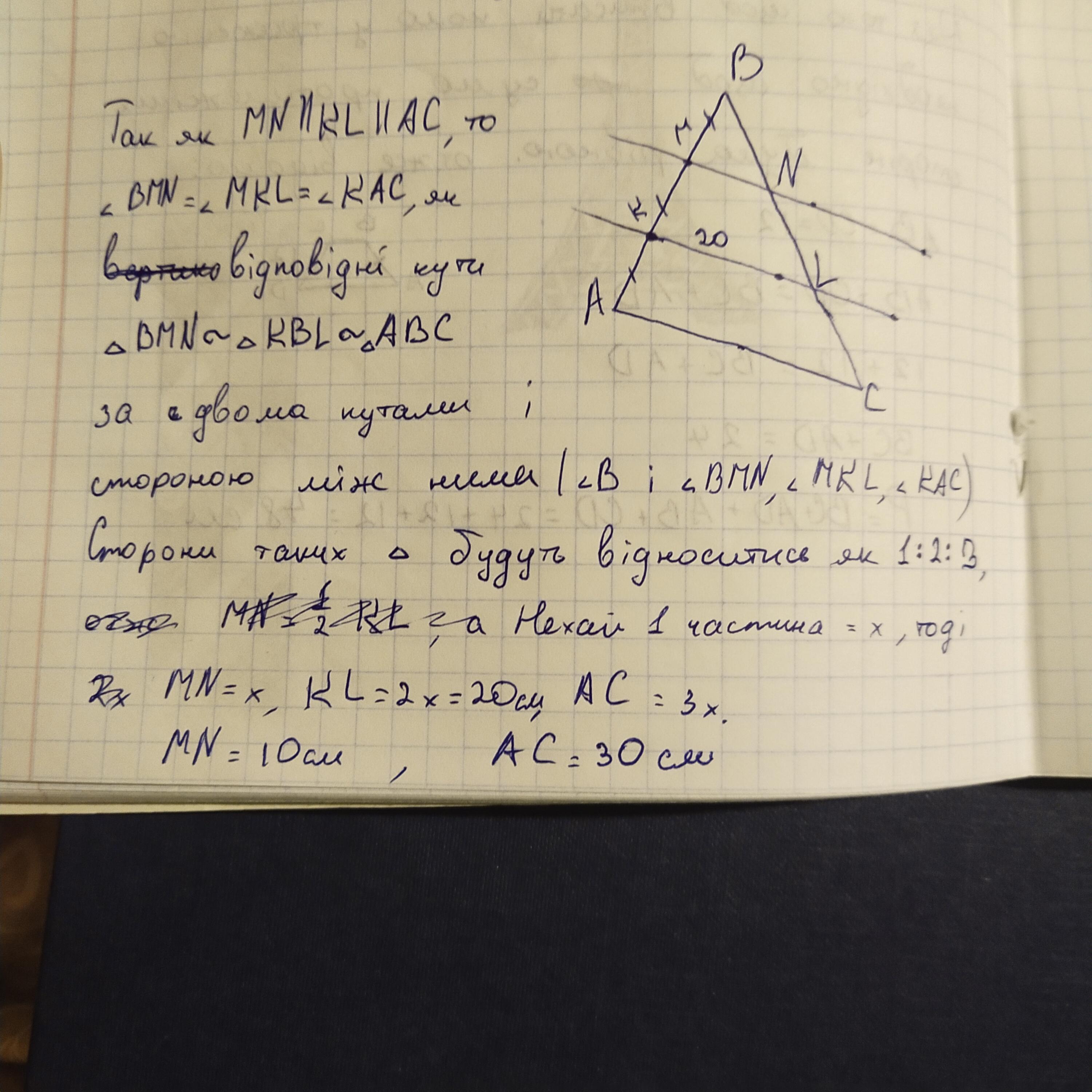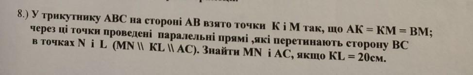 8.) У трикутнику ABC на стороні AB взято точки к i м так, що АК = КМ = ВМ; через ці точки проведені паралельні прямі ,які перетинають сторону ВС в точках N i L (MN \\ KL \\ AC). Знайти MN і AC, якщо KL = 20см.