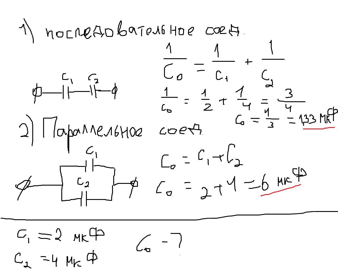 Два конденсатори ємністю 2 мкф і 4мкф. Визначити їх загальну ємність при послідовному і паралельному сполученні.