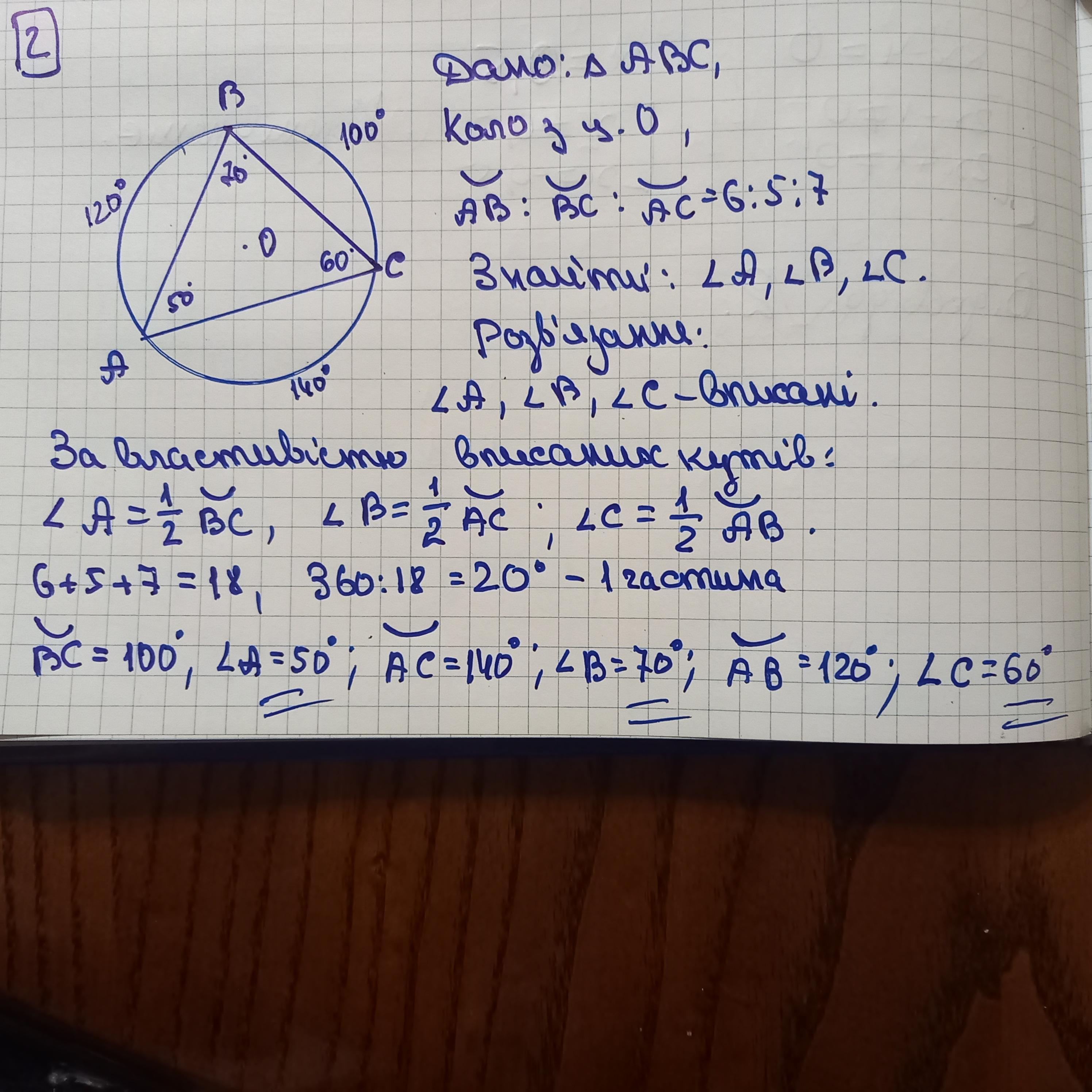 2. Вершини трикутника ділять коло на дуги, градусні міри яких відносяться як 6:5:7, Знайди кути цього трикутника.