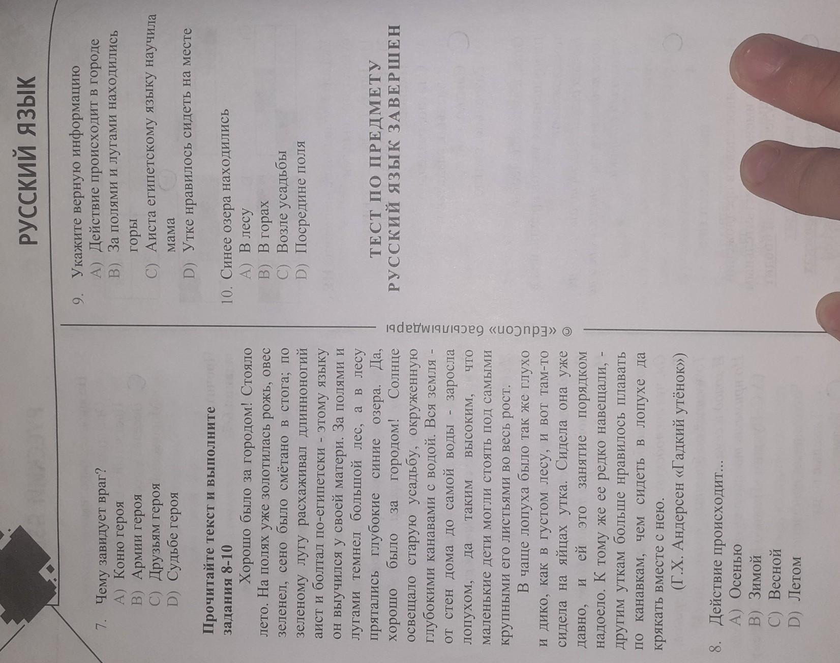 Чему завидует враг? A) Коню героя В) Армии героя С) Друзьям героя 1)) Судьбе героя Прочитайте текст и выполните задания 8-10 Хорошо было за городом! Стояло лето. На полях уже золотилась рожь, овес зеленел, ссно было сметано в стога: по зеленому лугу расхаживал длинноногий аист и болтал по-египетски - этому языку он выучился у своей матери. За полями и лугами темнел большой лес, а в лесу прятались глубокие синие озера. Да, хорошо было ГОРОДОМ! Солнце освещало старую усадьбу, окруженную глубокими канавами с водой. Вся земля - от стен дома до самой воды заросла лопухом. да таким высоким, что маленькие дети могли стоять под самыми крупными его листьями во весь рост. В чаще лопуха было так же глухо и дико, как в густом лесу, и вот там-то сидела на яйцах утка. Сидела она уже ей это занятие порядком надоело. К тому же ее редко навещали. другим уткам больше нравилось плавать давно, и ку по канавкам, чем сидеть в лопухе да крякать вместе с нею. (Г.Х. Андерсен «Гадкий утёнок») 8. Действие происходит... А) Осенью B) Зимой C) Весной D) Летом © «EduCon>> басылымдары () РУССКИЙ ЯЗЫК Укажите верную информацию A) Действие происходит в городе 13) За полями и лугами находились горы C) Аиста египетскому языку научила мама 1) Утке нравилось сидеть на месте 10. Синее озера находились А) В лесу B) В горах C) Возле усадьбы 1) Посредине поля ТЕСТ ПО ПРЕДМЕТУ РУССКИЙ ЯЗЫК ЗАВЕРШЕН ВАРИАНТ №7318 / РУССКИЙ ЯЗЫК