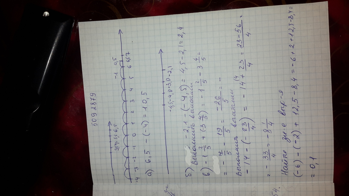 Найти с помощью координатной прямой сумму чисел а) -4 и 6,5 б)-4,5 и -2,1- б)-1 2/5+(-3 4/5) Выполнить сложение:а) (-64)+14,-5/7+2/3 Выполнить вычитание-14-(-23/4) Найти значение выражения:(-6)-(-2)+12,5-8,4 Решить уравнение: х-(-10)+9,4=-22 Решить уравнение:/1-х/=6 /2-х/=9