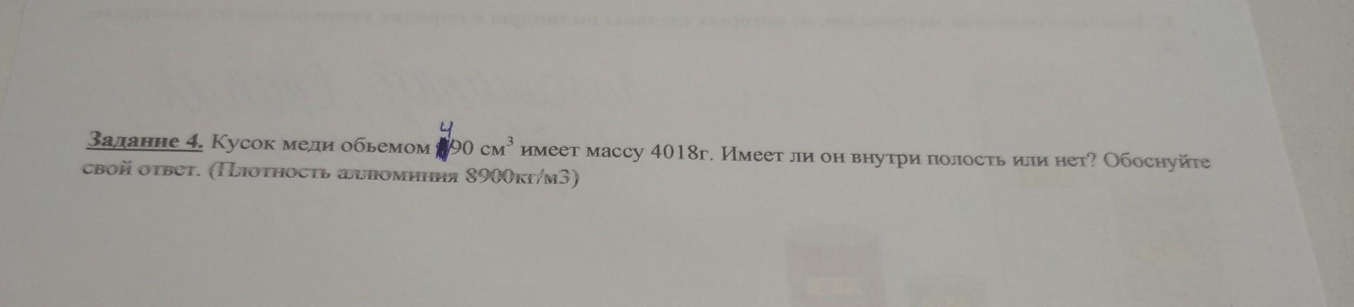 кусок меди объемом 490 имеет массу 4018. Имеет ли он внутри полость или нет .Плотность алюминия 8900м 3