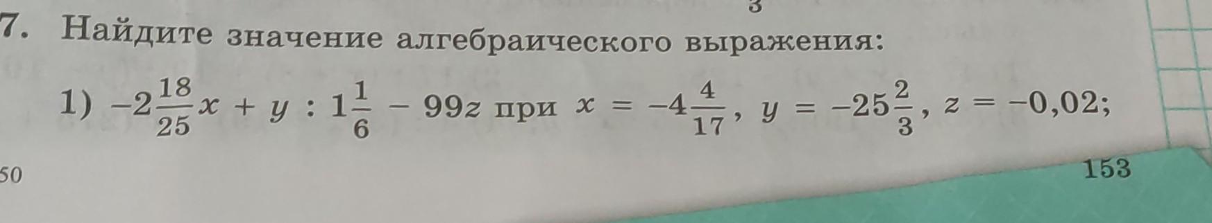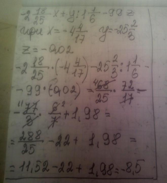 697. Найдите значение алгебраического выражения! +y: 1² - 992 пи x = -4-17, y = -25²/3, 11 1) -218 x + y : 25 ,2= -0,02