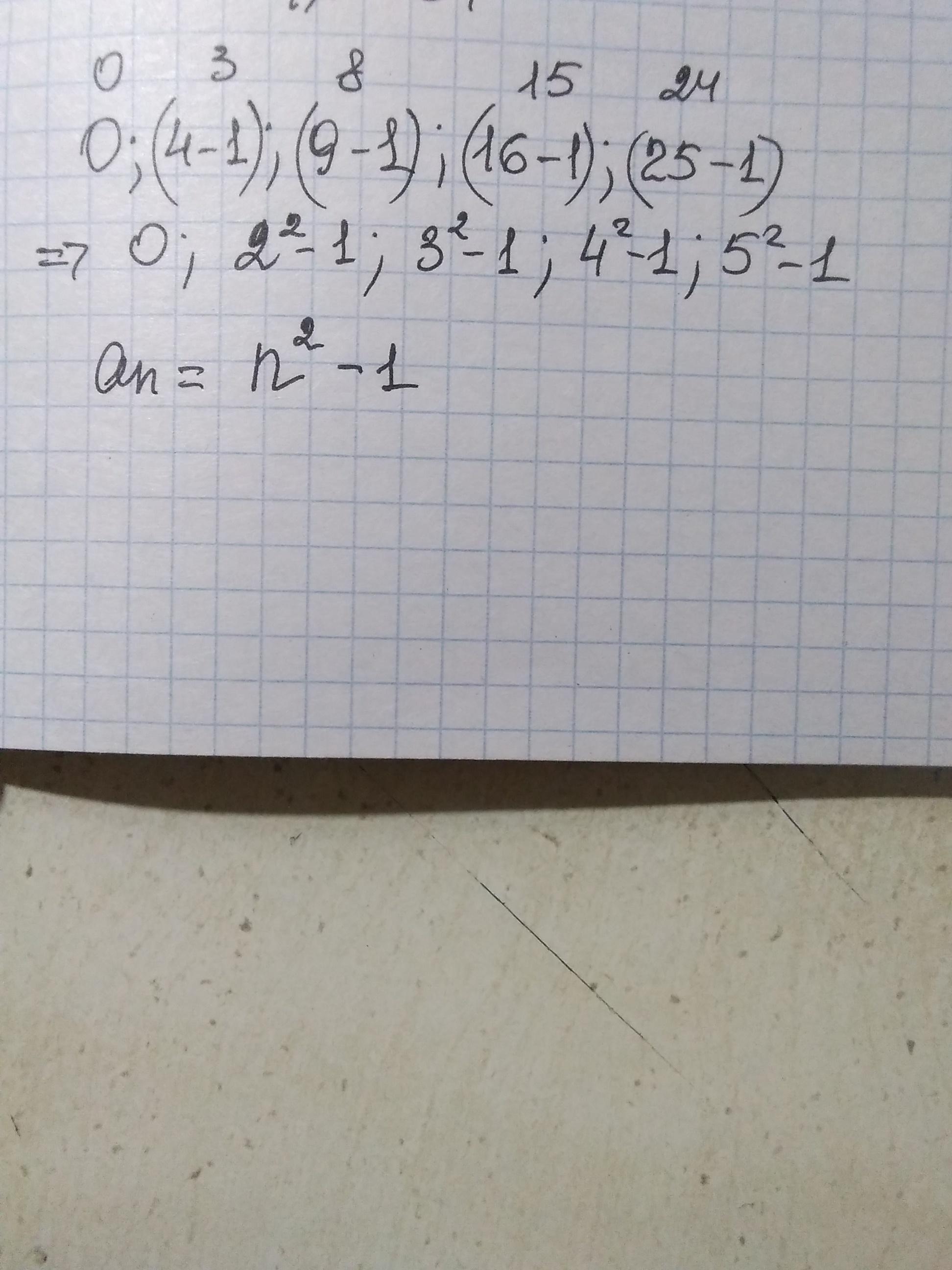 Найдите формулу n-го члена последовательности (ап), если известны следующие со первые члены 0,3, 8, 15, 24...