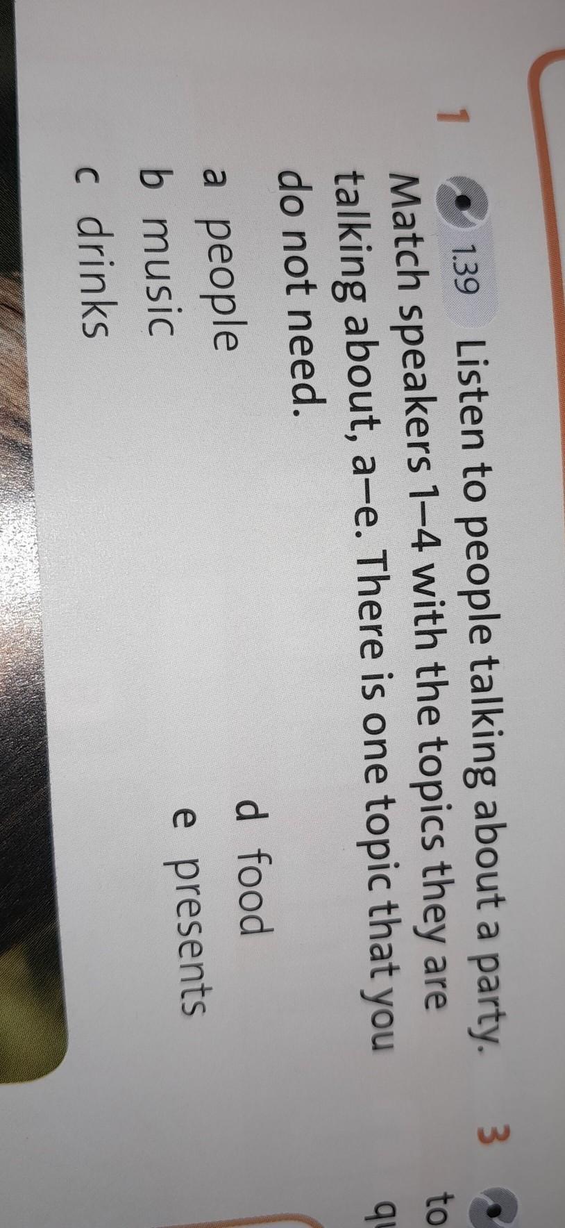 listen to pepole talking about a party. Match speajers 1-4 with the topics they are talking about, a-e. There is one topic that you do not need.