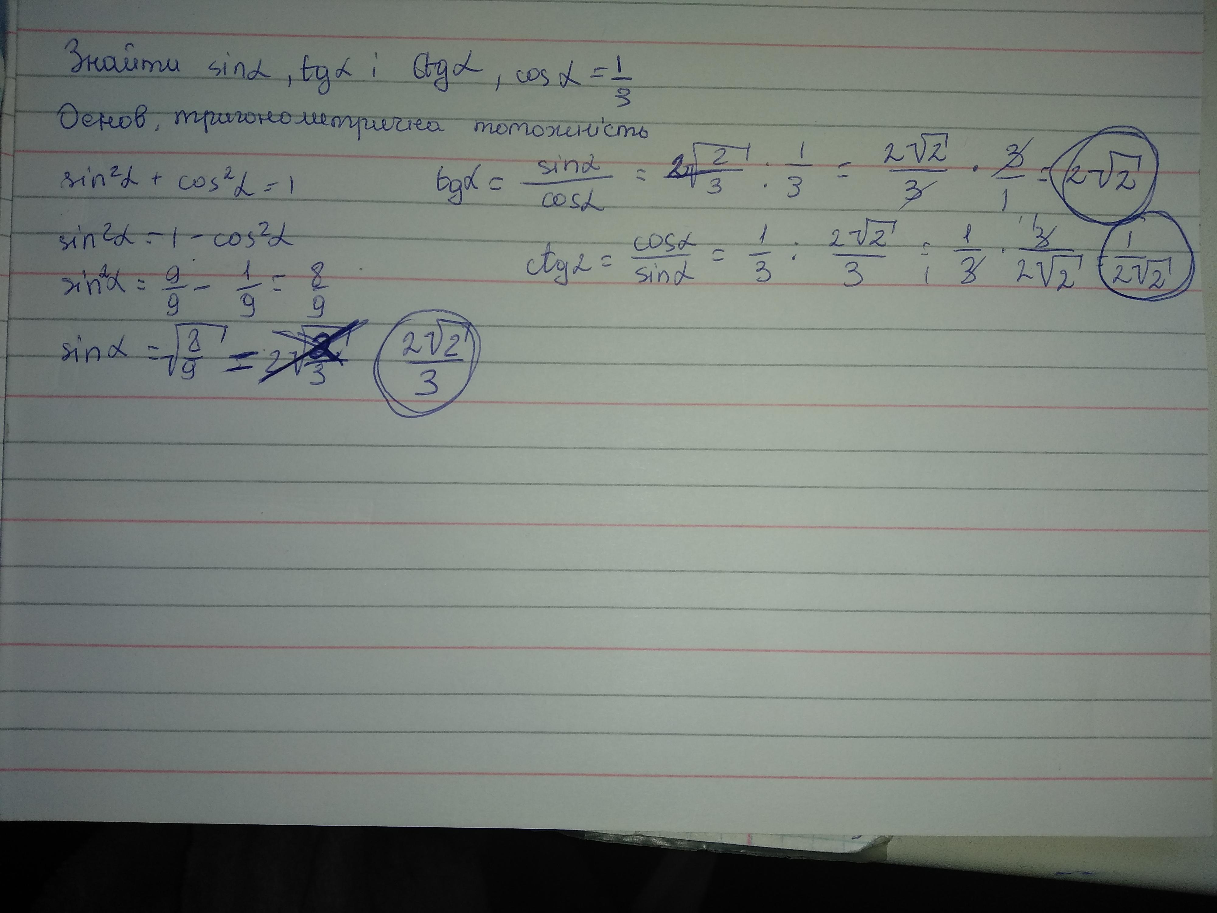 Відповідь: сін а= 2√2/3, тг= 2√2, ктг= 1/2√2