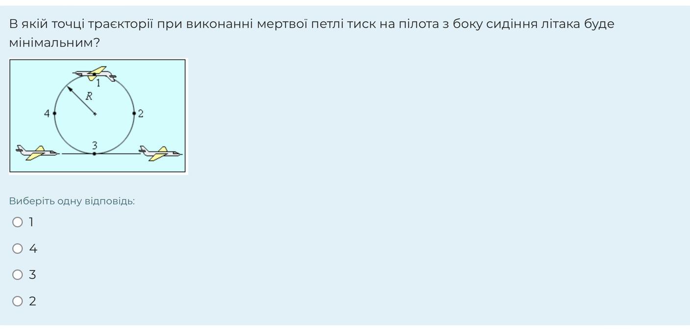 В якій точці траєкторії при виконанні мертвої петлі тиск на пілота з боку сидіння літака буде мінімальним?