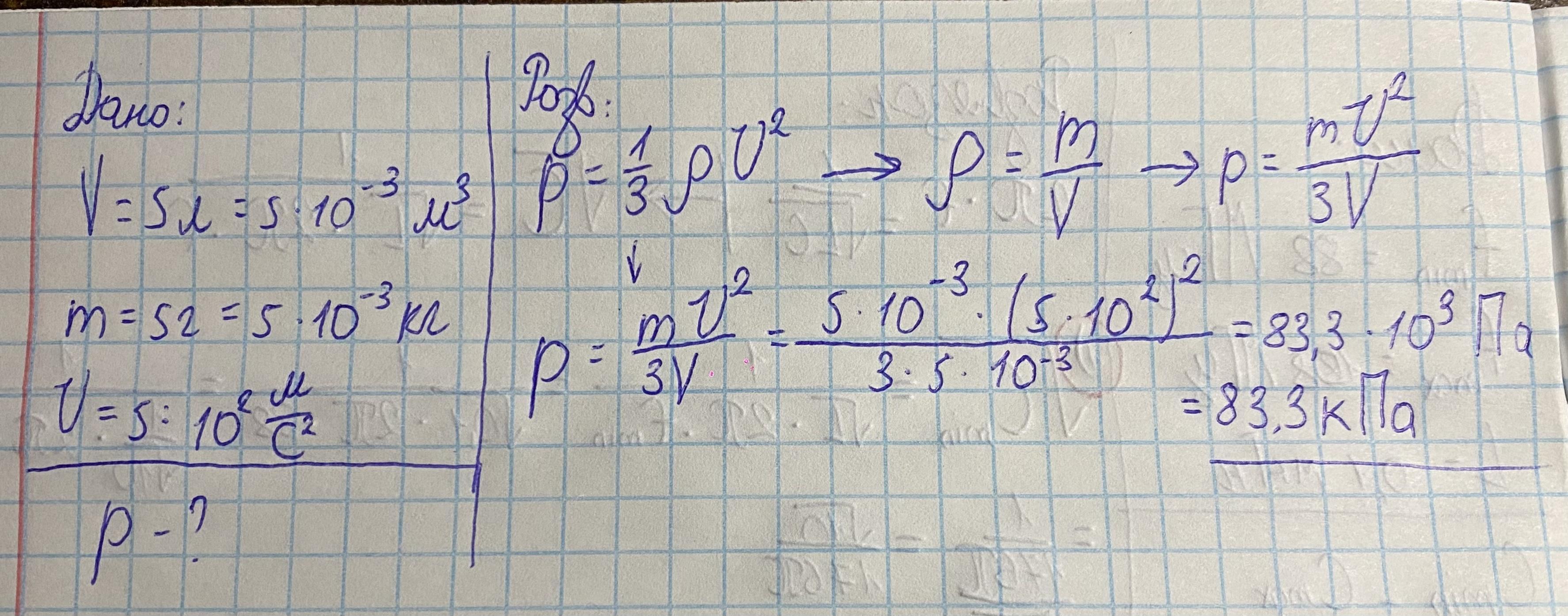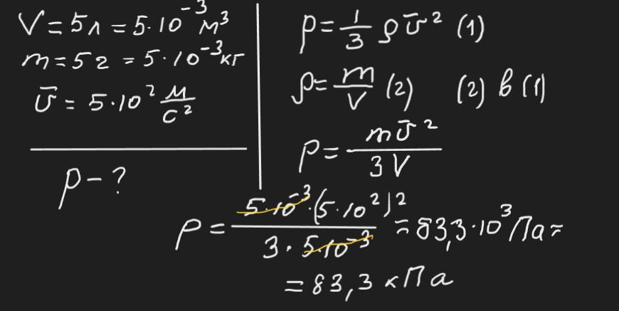 Визначити тиск молекул газу на стінки посудини об'ємом 5 л, якщо маса молекул складає 5 г, а їх квадратична швидкість 500 м/с.