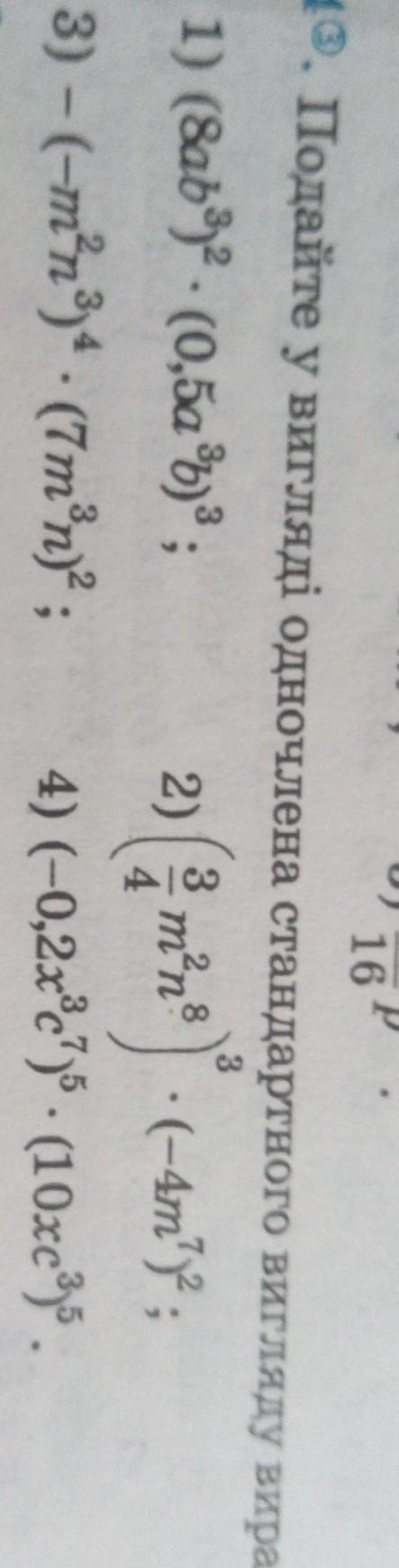 даю 100 балов Срочнооо . Подайте у вигляді одночлена стандартного вигляду вираз 1) (8ab³². (0,5a³b)³; 3 2) (imin®) (Am'y ; . 4 3) - (-m²n3)4 . (7m³n)2 ; 4) (-0,2x³c7)5 (10xc³5. 3 або якщо не понімаєте внизу є фото